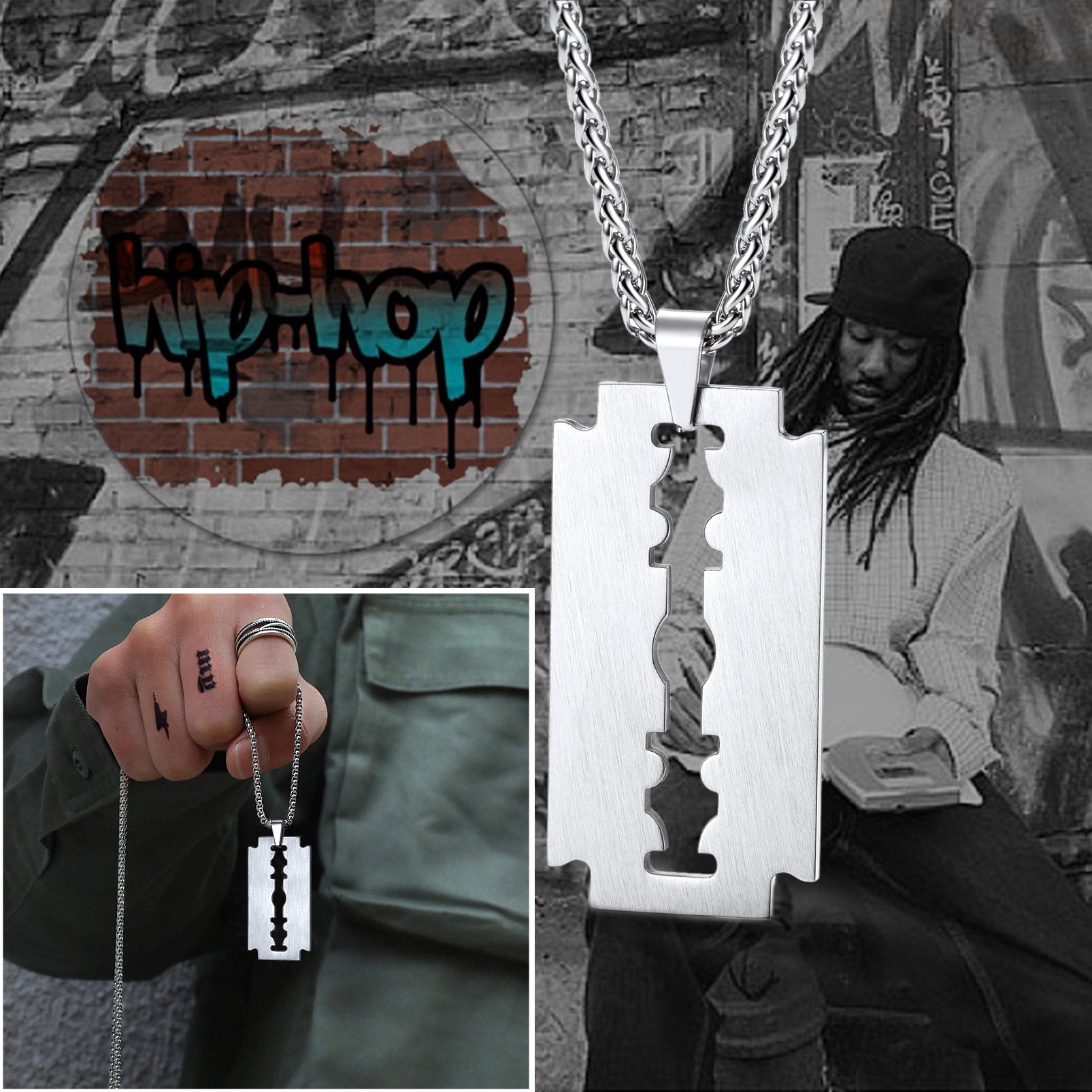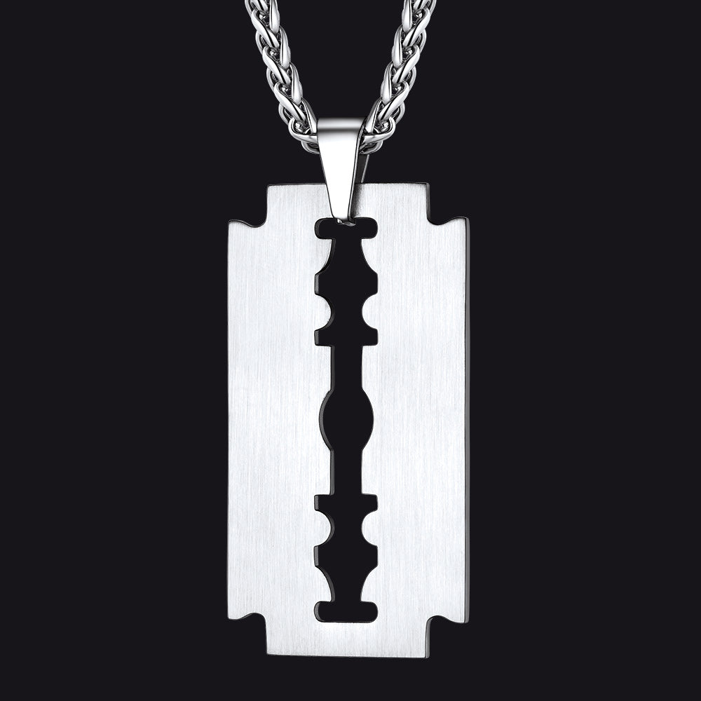 Diese Dog-Tag-Halskette ist vom Rock-Punk-Stil inspiriert und verfügt über einen Anhänger in Form einer Rasierklinge, der Ihrem Look eine rebellische und kantige Note verleiht. Der Dog-Tag-Anhänger wird mit einer passenden Kette geliefert und ist somit ein komplettes und stilvolles Accessoire.