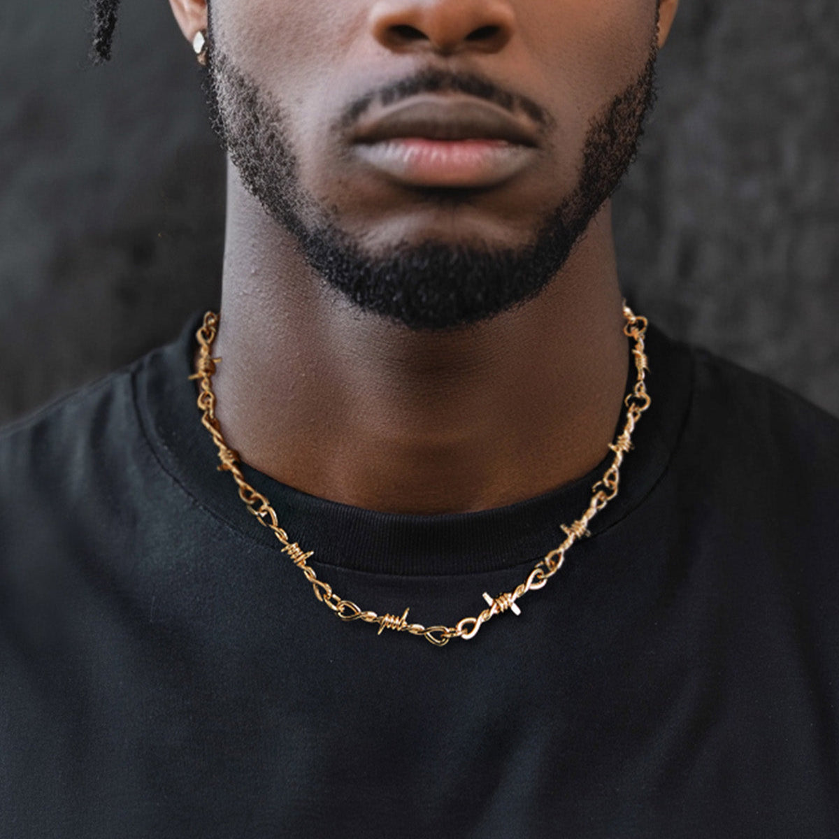 Verleihen Sie Ihrem Stil mit dieser gotischen Stacheldrahtkette mit Dornen einen kantigen Touch. Erhältlich in 45,7 cm und 55,9 cm Länge und 6 mm Breite, besticht diese Edelstahlkette mit ihrem einzigartigen Dornendesign für einen mutigen, rebellischen Look. Perfekt für Männer und Frauen, die alternative Mode lieben. Sie ist langlebig, hypoallergen und anlaufgeschützt. Ideal zum Kombinieren oder Solotragen – ein Must-have für Gothic-, Punk- oder Streetwear-Fans.