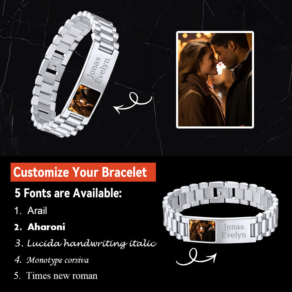 The custom Bar Watch Strap Chain Bracelet with picture is cut and crafted from premium stainless steel, double-push deployment button, comfortable to wear. The strap bracelet craftsmanship is polished. Give the gift of handsome style with a striking design to the favorite man in your life.