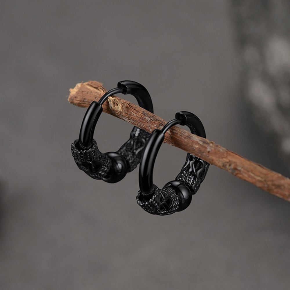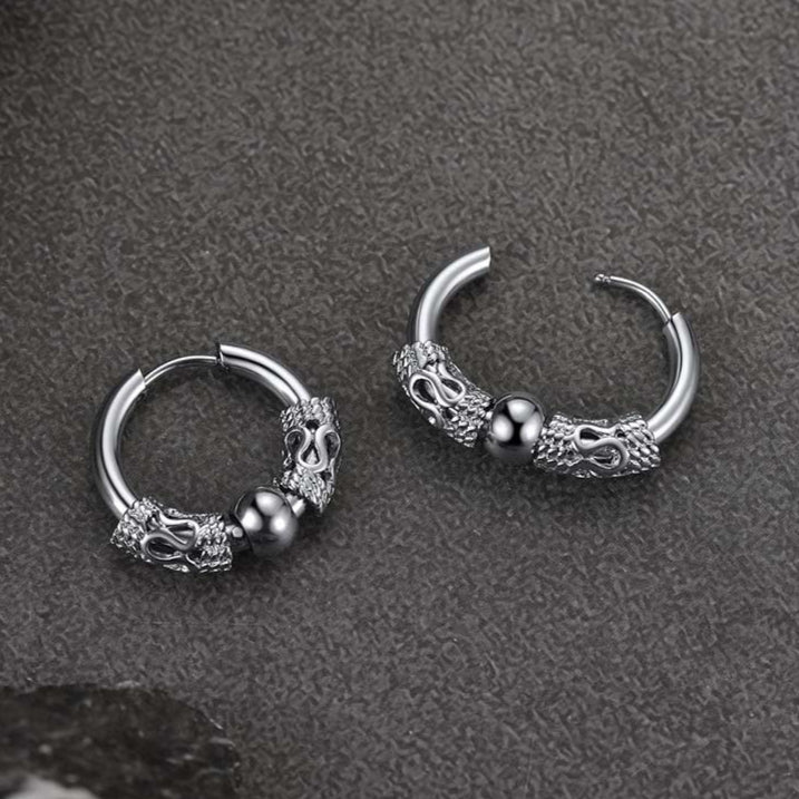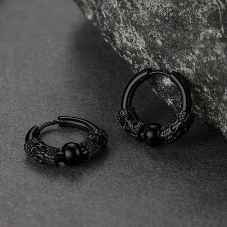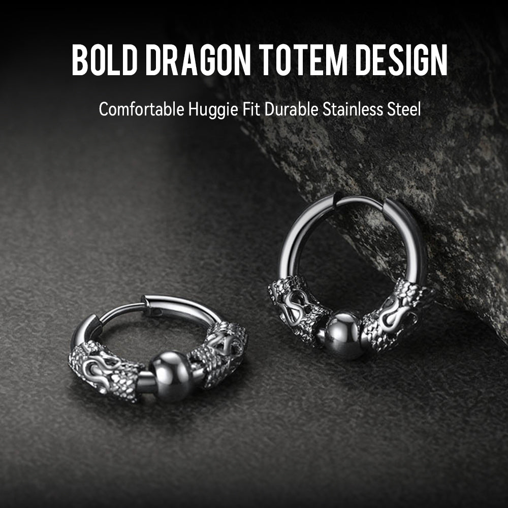 Vintage Gothic Dragon Totem Huggie Hoop earrings for men, novel styles, exquisite craftsmanship, different from ordinary earrings, give you a strong visual impact. Safety material, lead-free, nickel-free, anti-allergic, excellent polishing and plating process, keep color lasting. Wear it to participate in cosplay parties and rock concerts, you will get more attention and praise. It is also a wonderful accessory for Halloween.