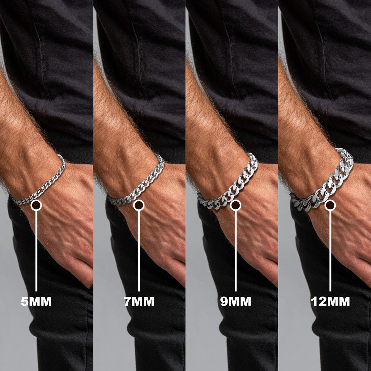 Cuban Chain Link Bracelet for Men, available in 5mm, 7mm, 9mm, and 12mm widths. Crafted for durability and boldness, this sleek bracelet is perfect for adding a touch of luxury to any outfit. Hypoallergenic and versatile, its ideal for casual or formal wear. A timeless piece for modern men!