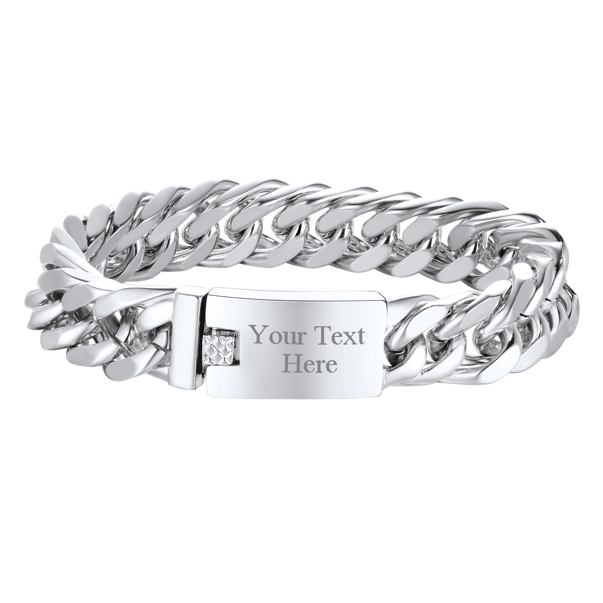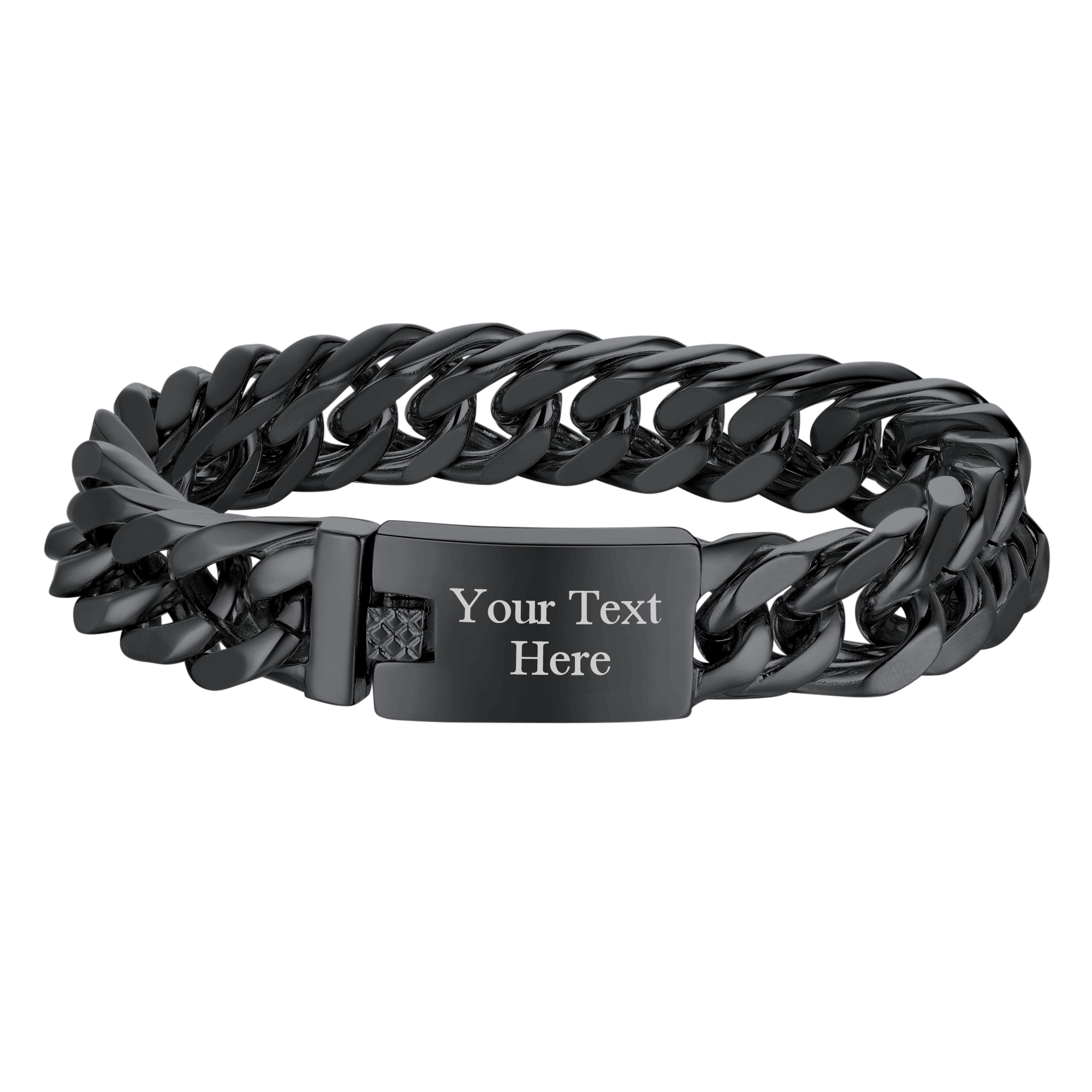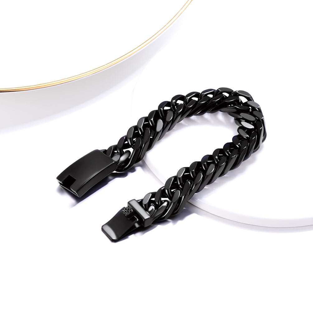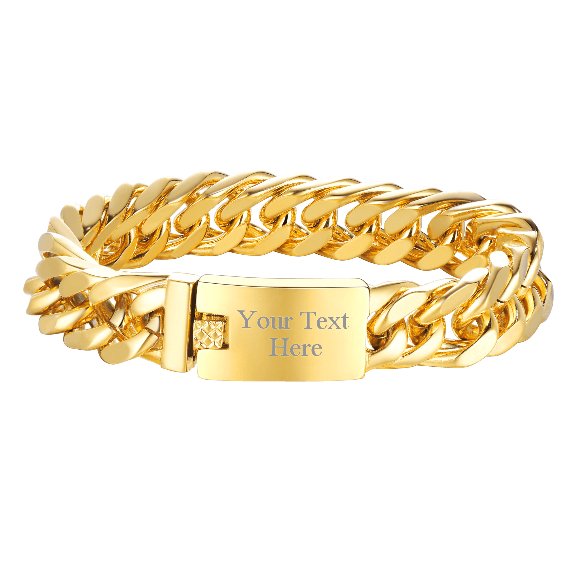Cuban link chain bracelet for men, hunky hip hop jewelry custom engraved text on bar ID, Beautifully crafted, the shine is excellent and it is cumbersome. Nice looking with a classic sense of style, sturdy lobster clasp. 316L stainless steel based, 18K gold plated, free of nickel. Fashion gift for men rapper.