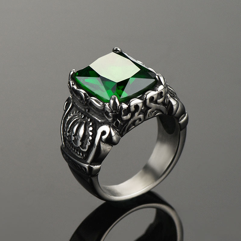 Edwardian crown crystal green emerald ring for men, with a perfect simulated green emerald gemstone solitaire, silver filigree crown design, this full-cut square gem is 10mm in width. Made of genuine stainless steel, not tarnish, no rust, no allergies, lead free and nickel free. A wonderful ring gift for men on Halloween, Christmas, Easter, birthday, graduation, or any special date.