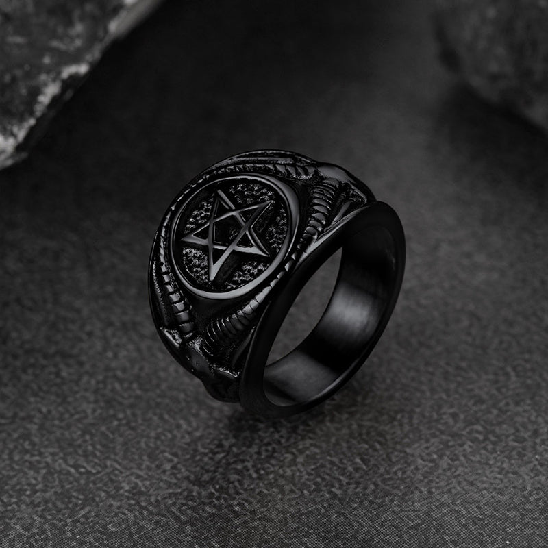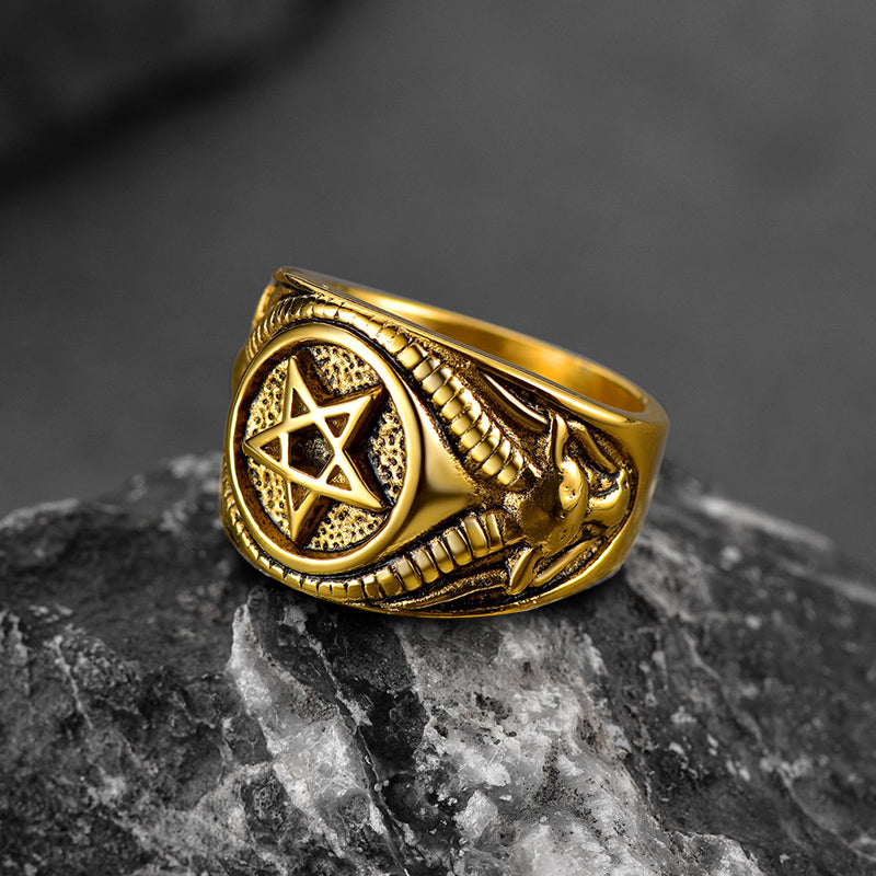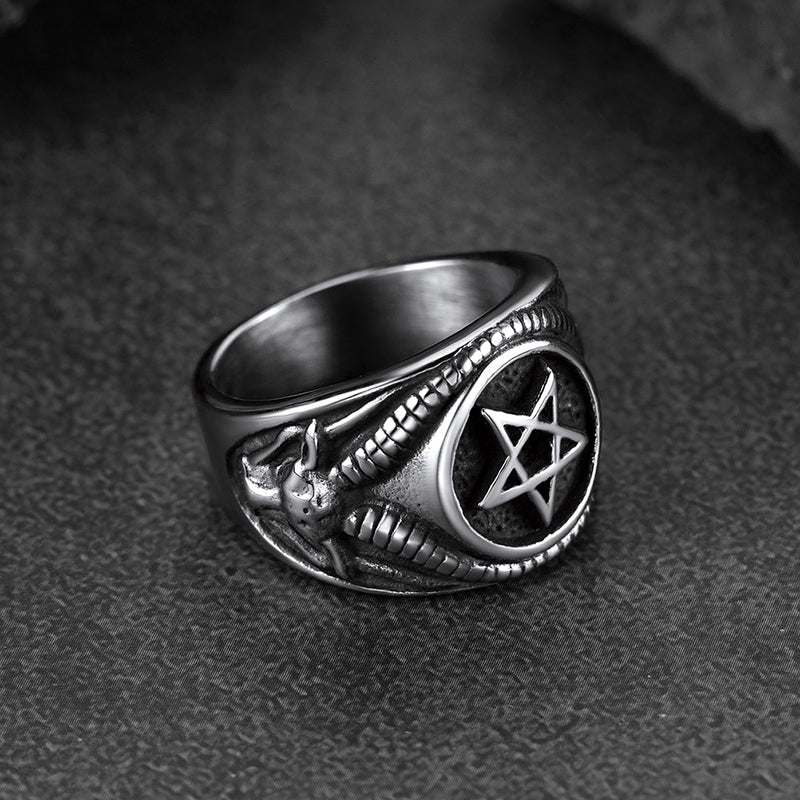 Men Satanic Goat Pentagram Ring: Gently embracing your finger shall be the Pentacle Signet Ring that is screaming with timeless appeal capturing attention from all around. Retro-style Baphomet ring adds eye-catching sparkle to any ensemble of yours. Baphomet is a deity allegedly worshipped by the Knights Templar that subsequently became incorporated into various occult and Western esoteric traditions.