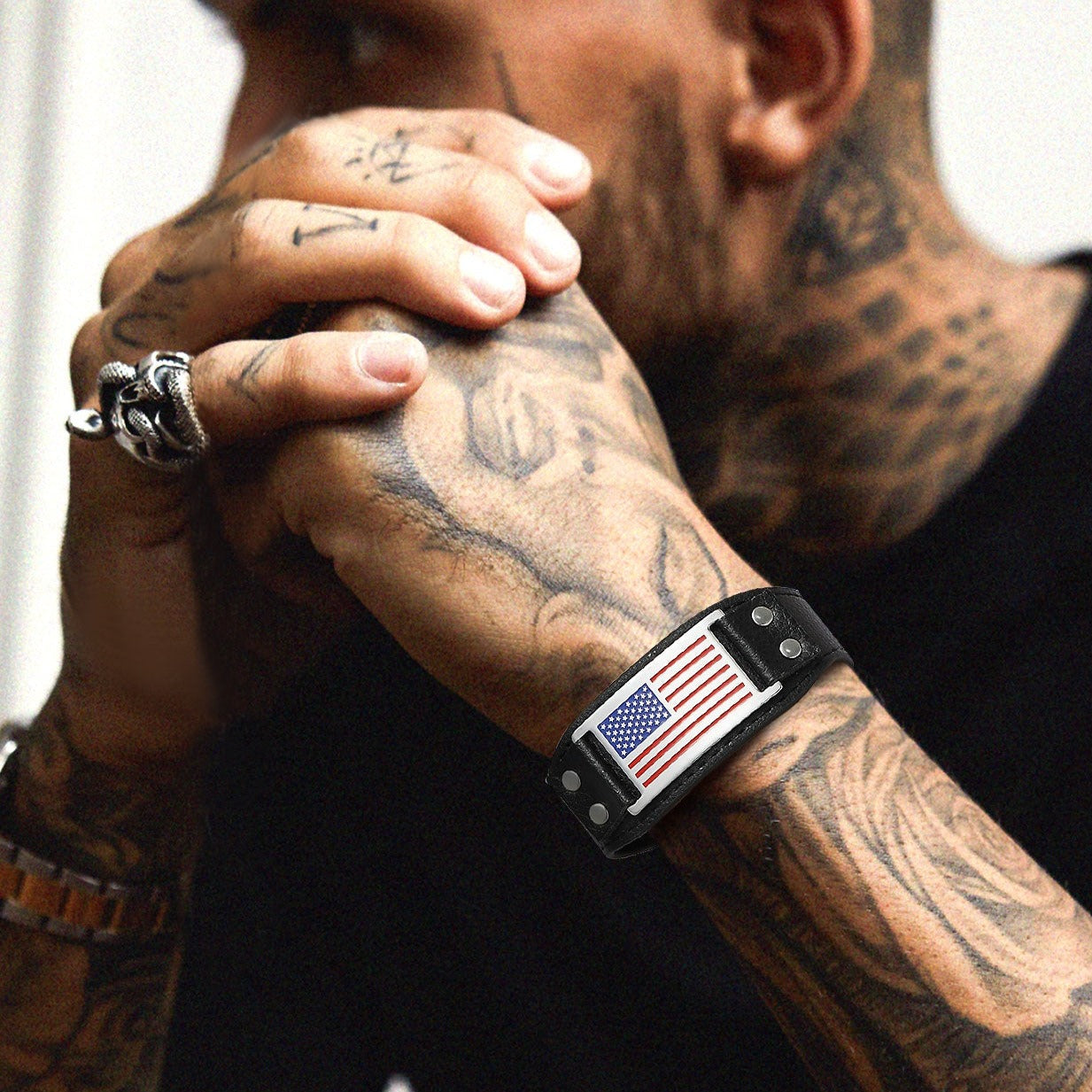 A pulseira de couro preto foi desenhada com uma bandeira americana em comemoração ao 4 de julho, Dia da Independência, Memorial Day, Dia de Martin Luther King, Dia dos Presidentes e Dia dos Veteranos. Você estava usando esta pulseira de couro patriota com orgulho, demonstrando seu amor e patriotismo. Com couro de microfibra de alta qualidade e ecologicamente correto, sem níquel, hipoalergênico e adequado para peles sensíveis.