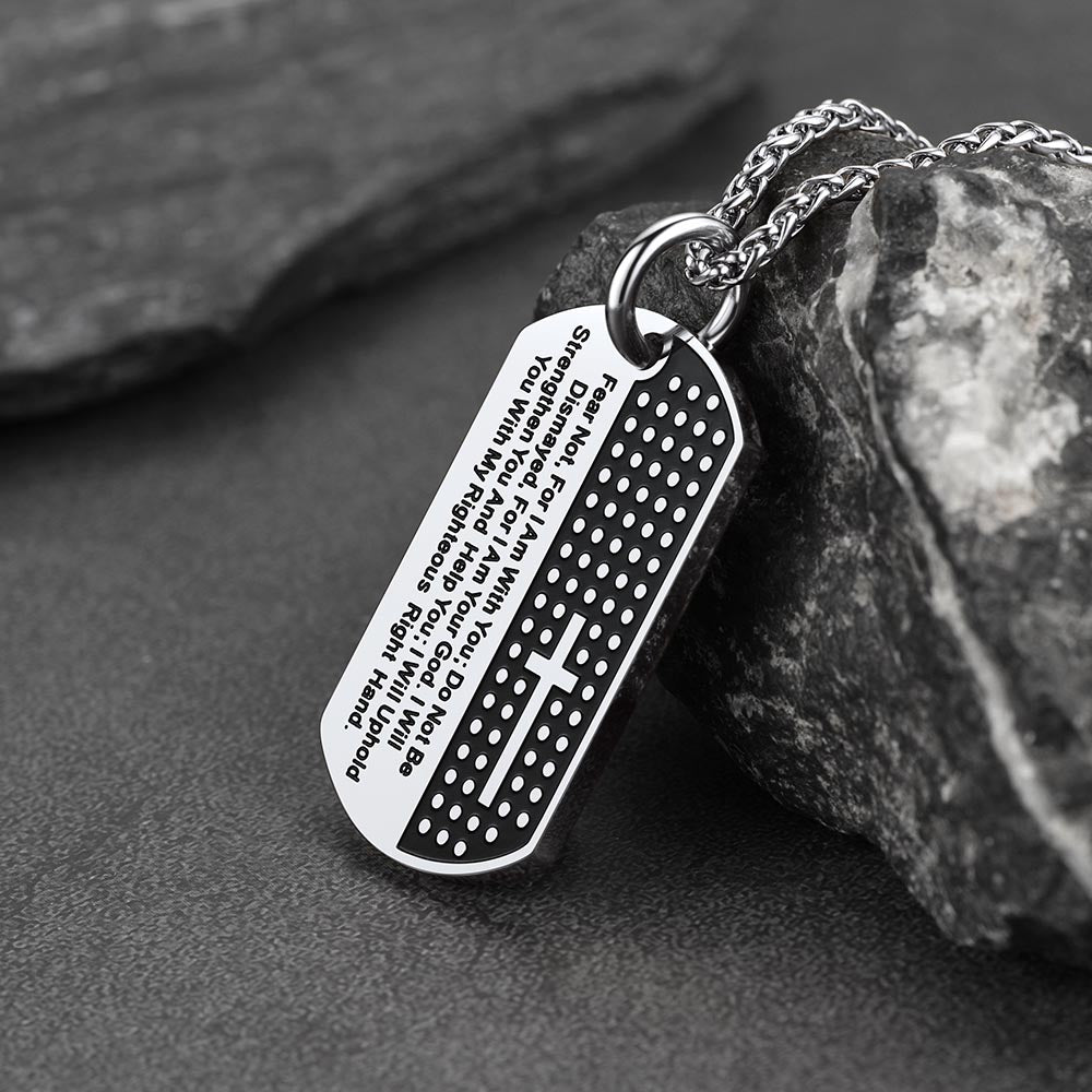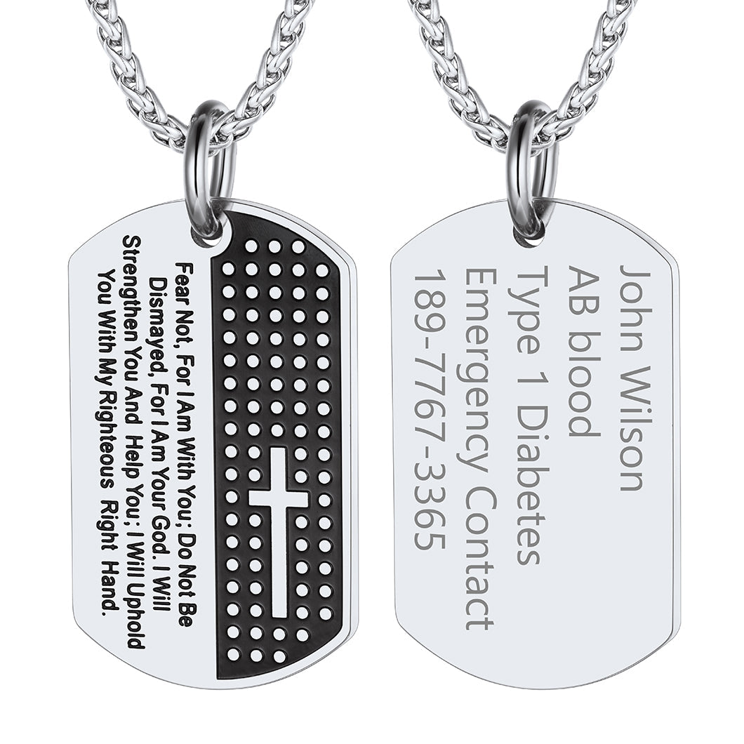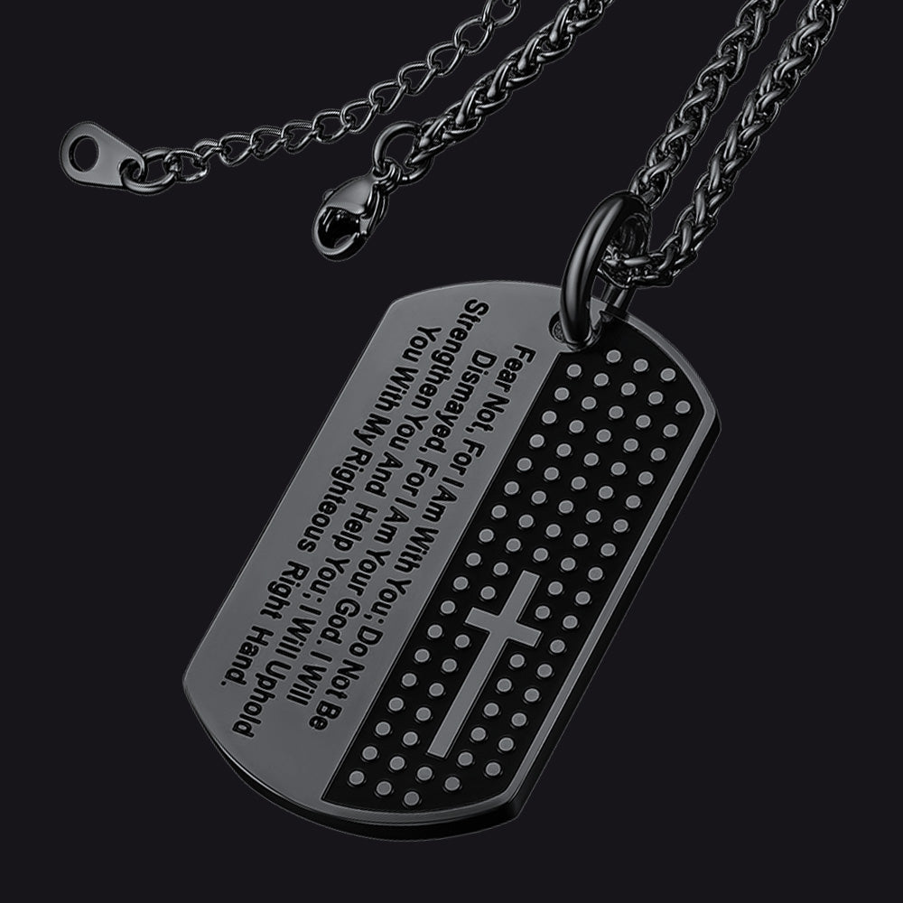 Colar com pingente de dog tag com versículo bíblico vintage, oração bíblica gravada e símbolo da cruz, colar religioso militar masculino com corrente de trigo redimensionável, hipoalergênico e confortável de usar. Vem em uma caixa de presente pronta para presentear, com uma bolsa preta. Presente perfeito para pai, irmão, namorado ou alguém importante para você em qualquer festival.