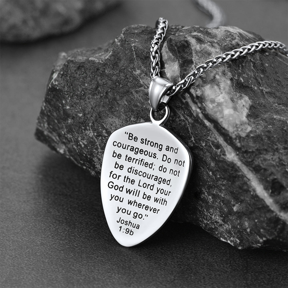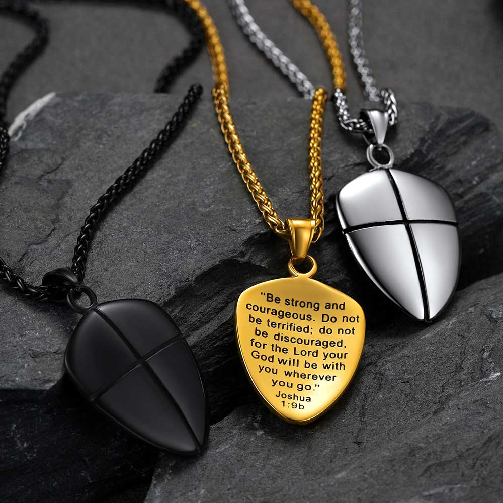 Colar com escudo e cruz cristã Josué 1:9 para homens, mostre sua personalidade e fé. A vida pode ser cheia de desafios, tristezas e decisões difíceis. Mas mesmo em meio às dificuldades, precisamos ser fortes e corajosos.