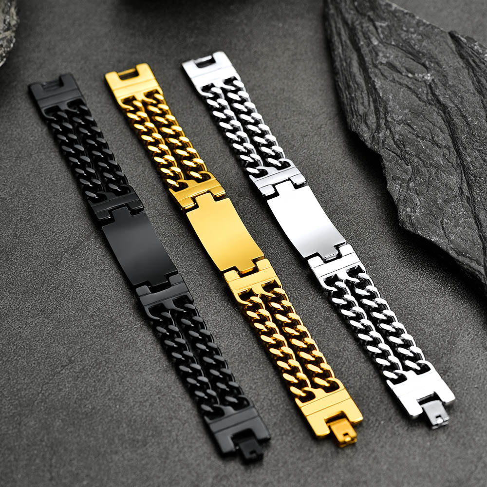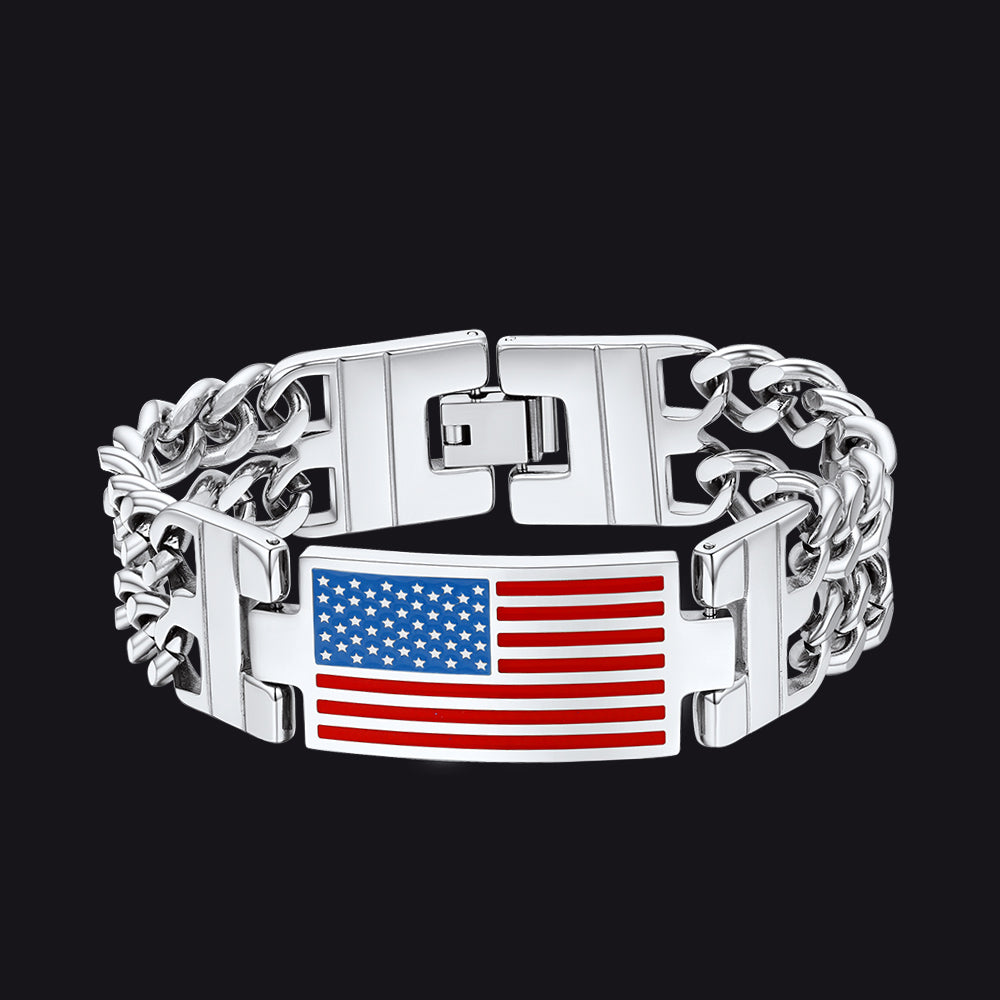 A pulseira de aço inoxidável com a bandeira americana foi projetada para celebrar o Dia da Independência, o Dia da Memória, o Dia de Martin Luther King, o Dia dos Presidentes e o Dia dos Veteranos. Usar a pulseira de corrente cubana Casaivy com a bandeira dos EUA demonstra orgulhosamente seu amor e patriotismo. 100% aço inoxidável com banho de ouro amarelo ou preto é durável, sólido e altamente resistente à ferrugem ou manchas.