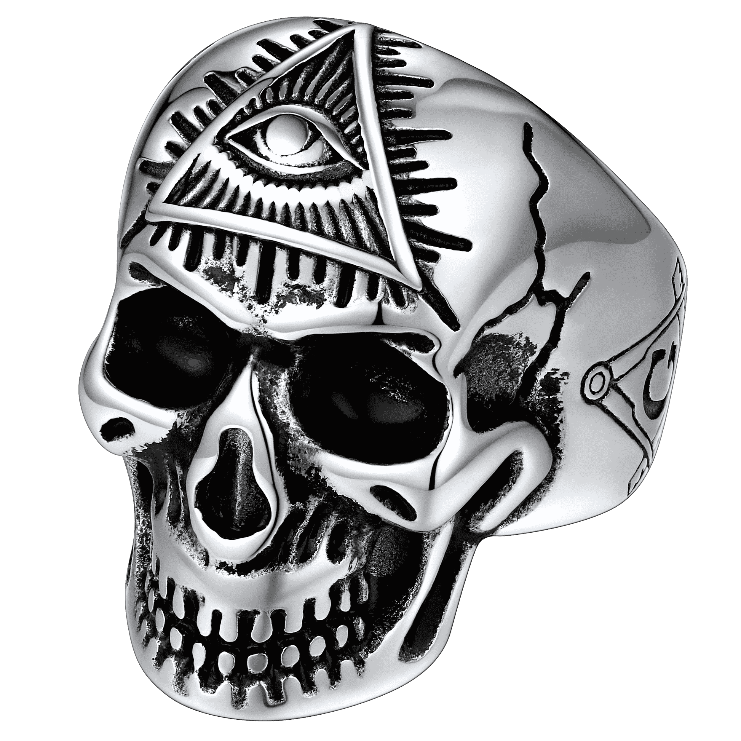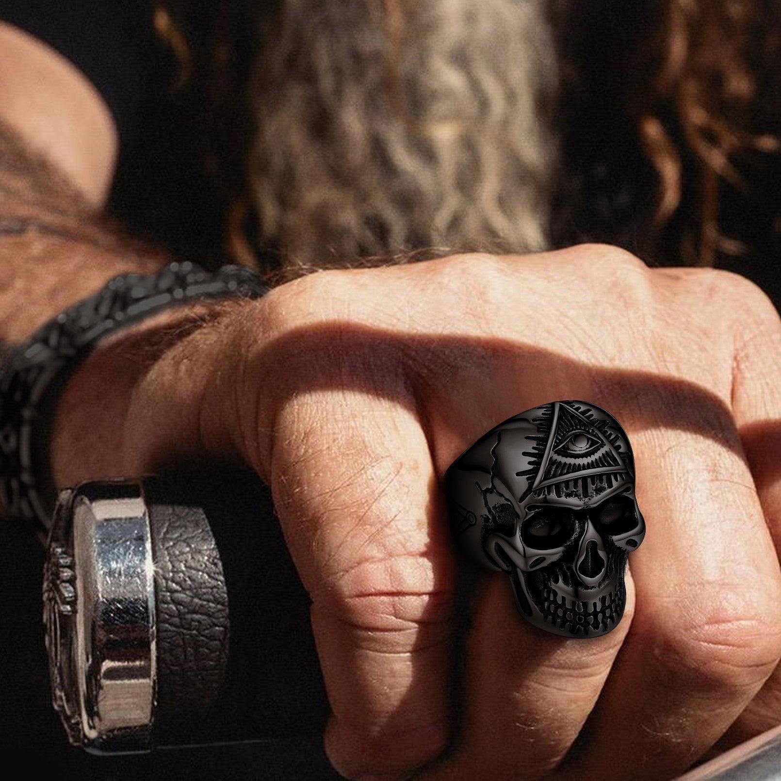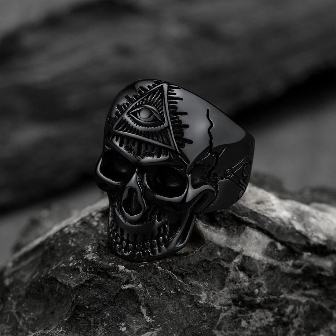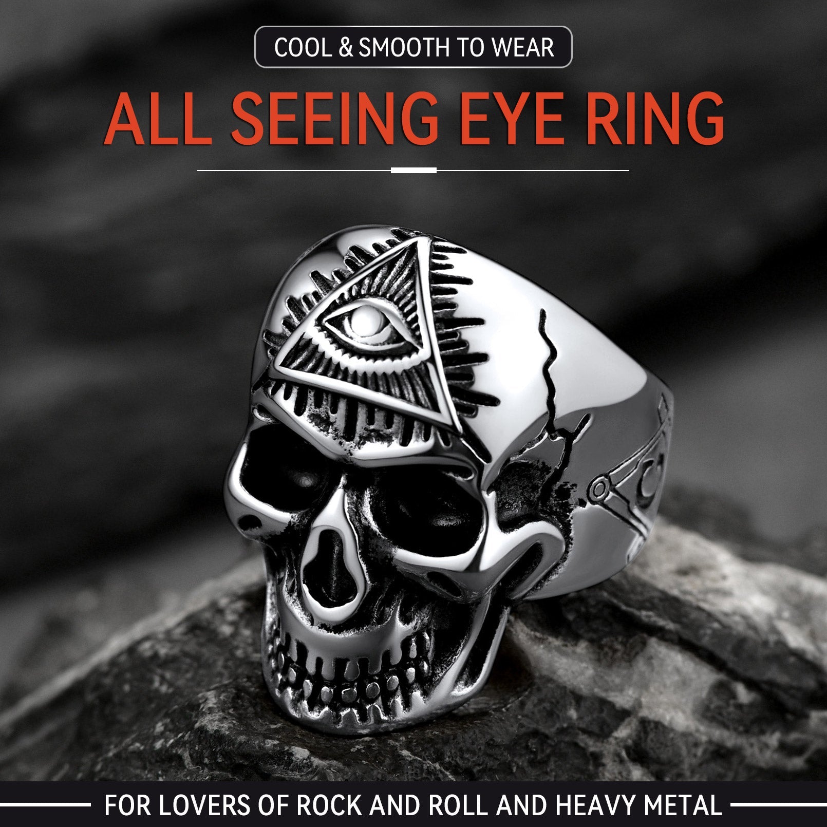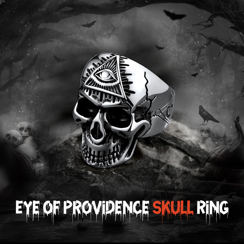 Anel de caveira com o Olho da Providência para homens, demonstre sua fé. O Olho da Providência, ou o Olho Que Tudo Vê de Deus, é um símbolo que representa o olhar de Deus zelando pela humanidade. Este anel de olho de esqueleto pode ser um presente perfeito para quem você ama.