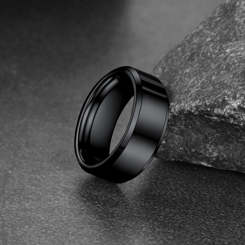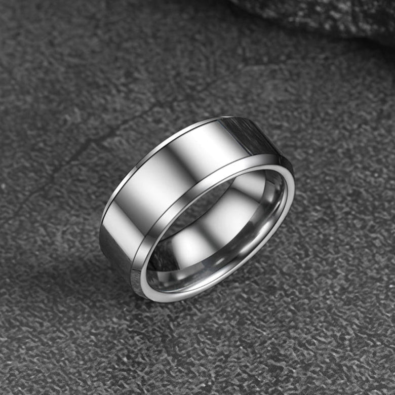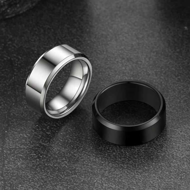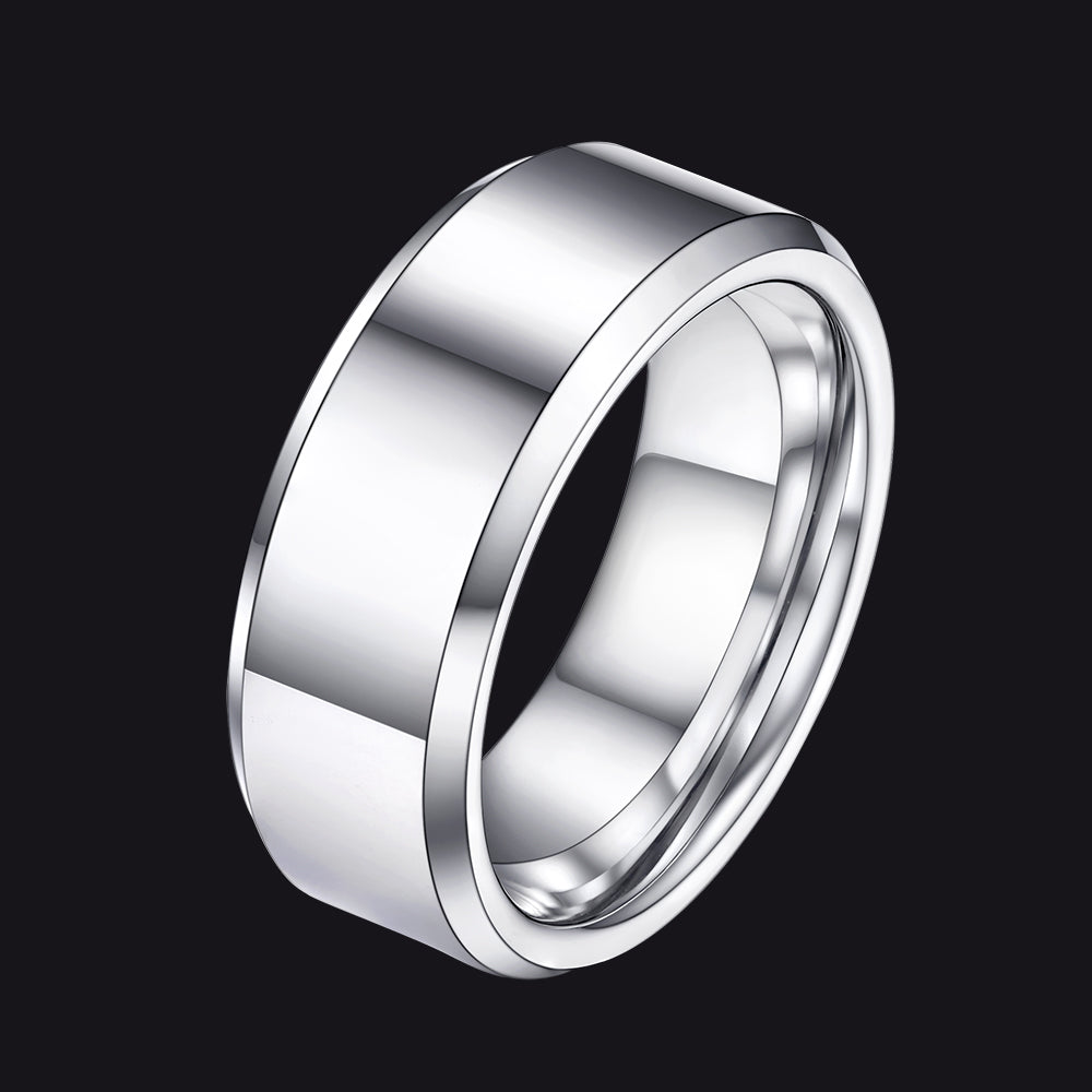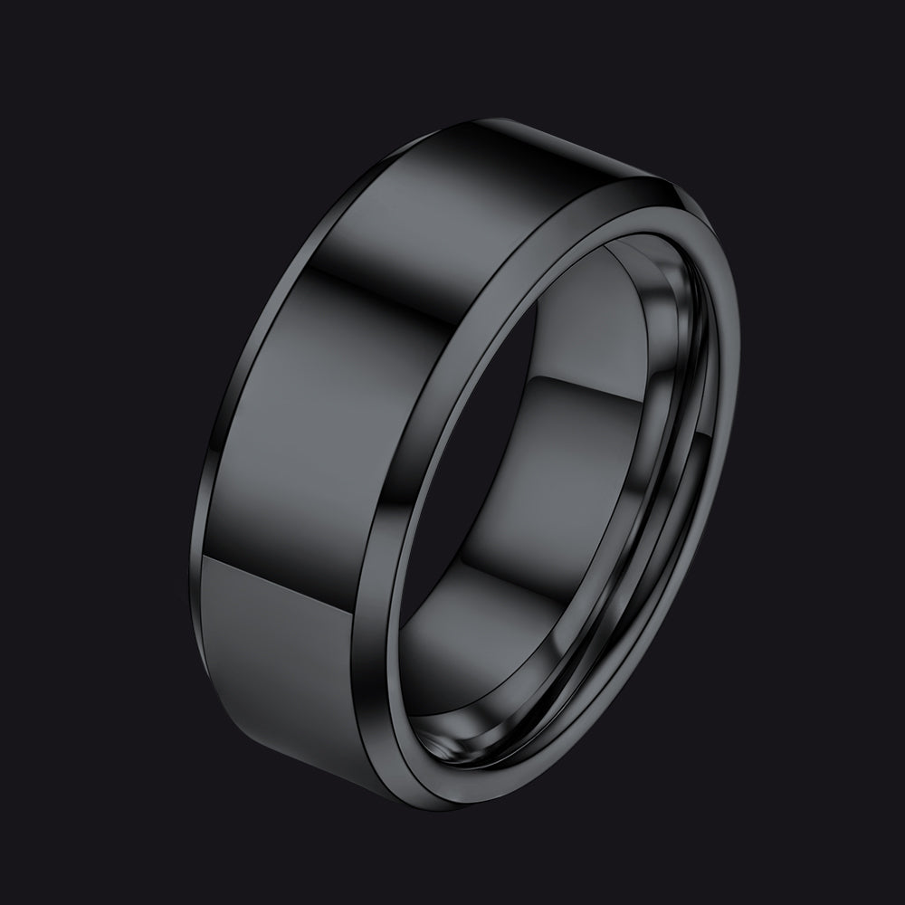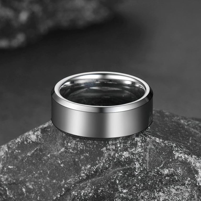 Design de anel de carboneto de tungstênio moderno para homens, com superfície simples e altamente polida e borda chanfrada.