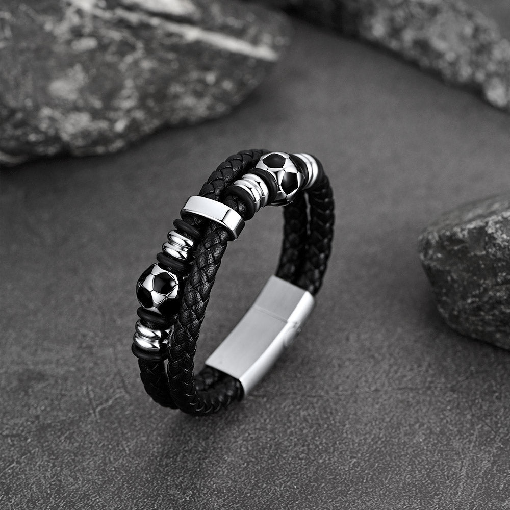 O couro preto representa força e resiliência, enquanto o design trançado adiciona um toque de estilo punk. É uma peça marcante que incorpora a paixão e a energia do futebol.