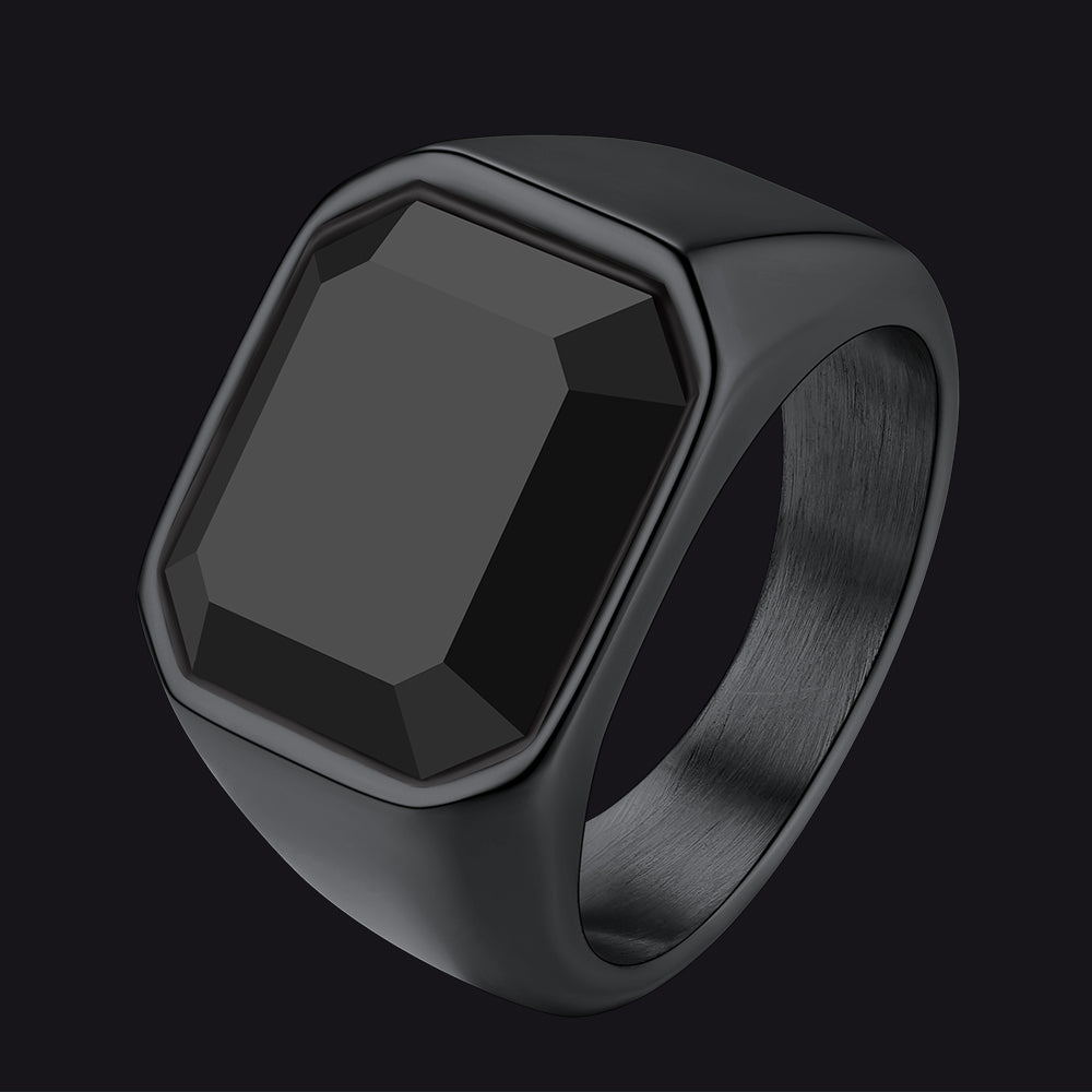 O anel de pedra preciosa ônix negra combinado com o design de sinete de ágata quadrada cria um visual ousado e moderno, adequado tanto para homens quanto para mulheres.