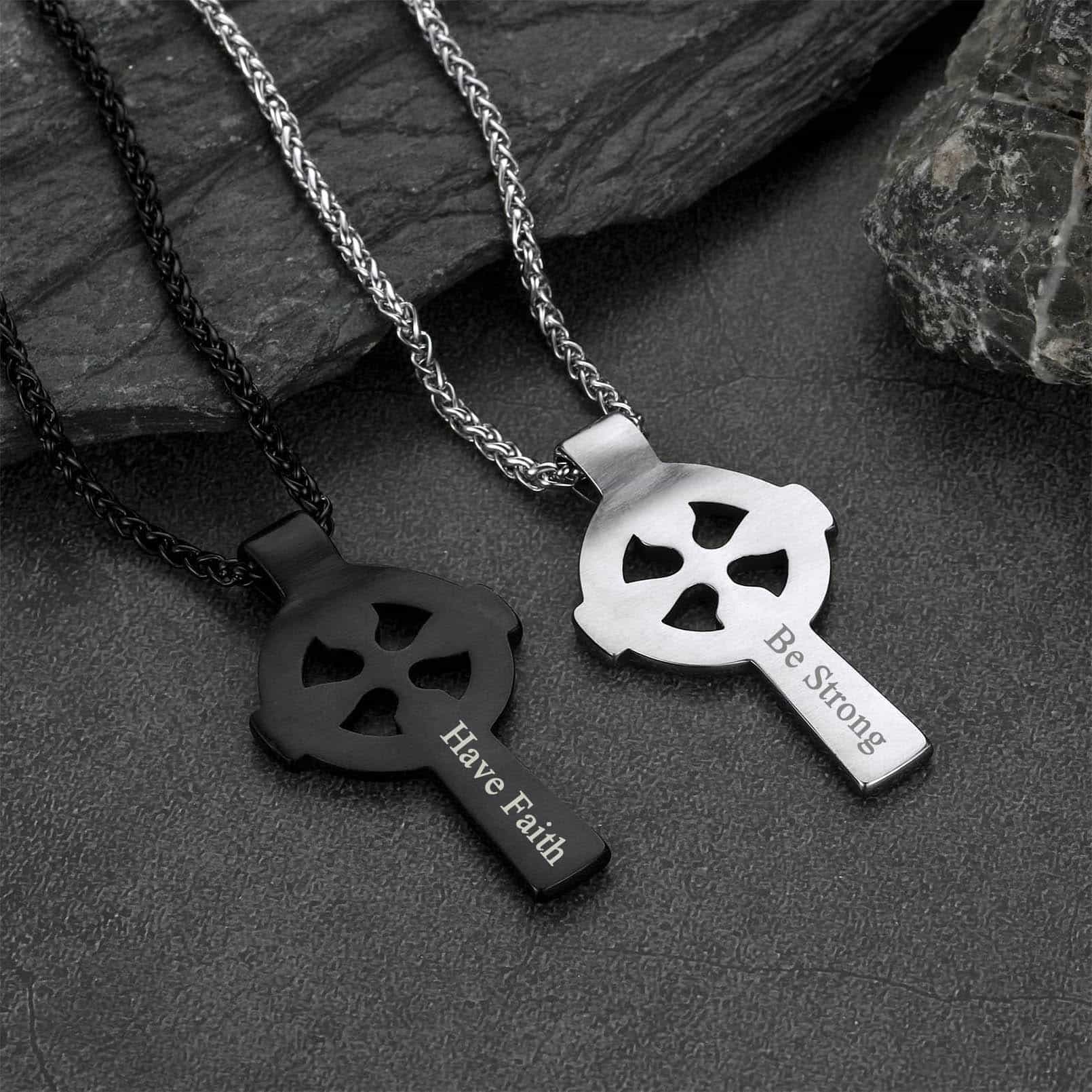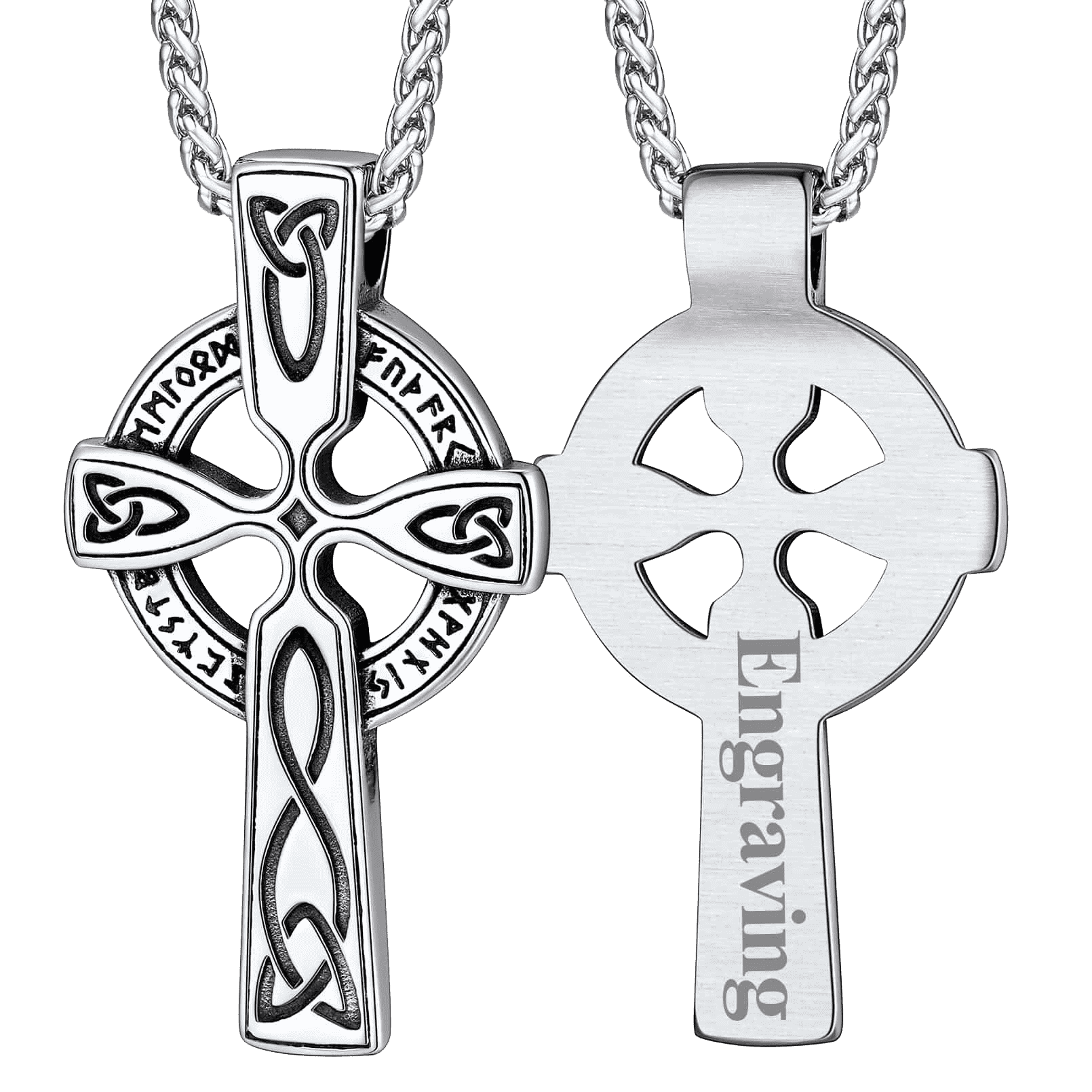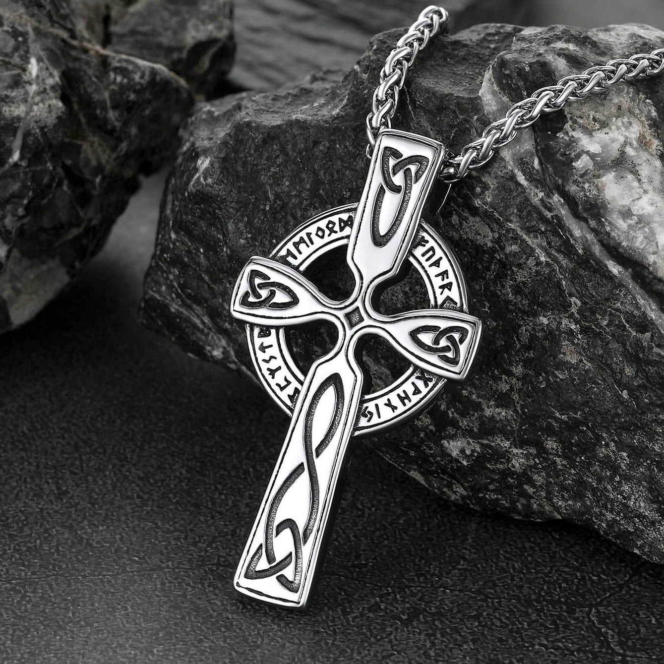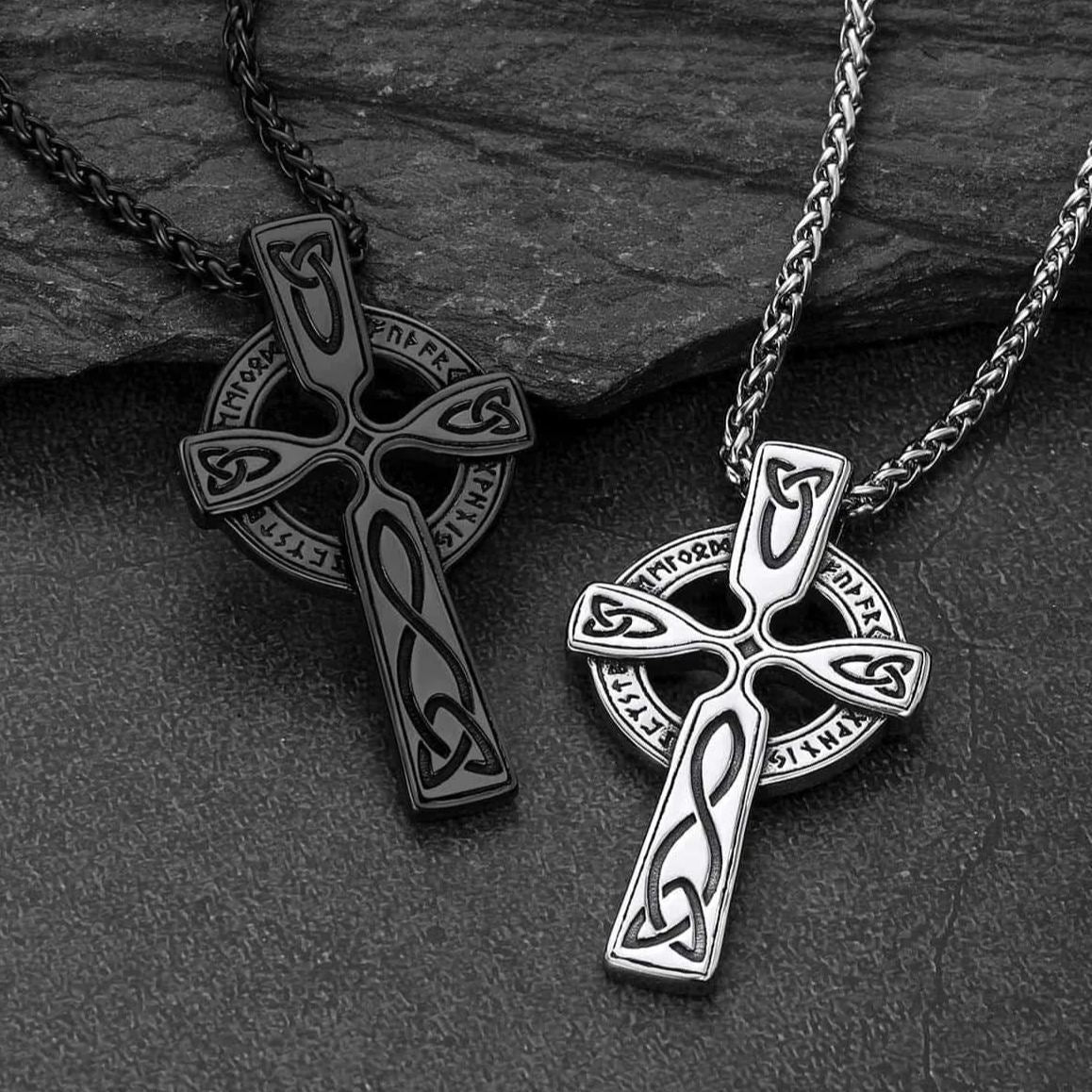 Colar de cruz com nó celta e runas vikings. A construção da cruz celta apresenta uma cruz tradicional acentuada por um círculo ao redor da intersecção dos braços e da haste. Os nós celtas são uma variedade de nós e representações gráficas estilizadas de nós usados para decoração, representando lealdade.