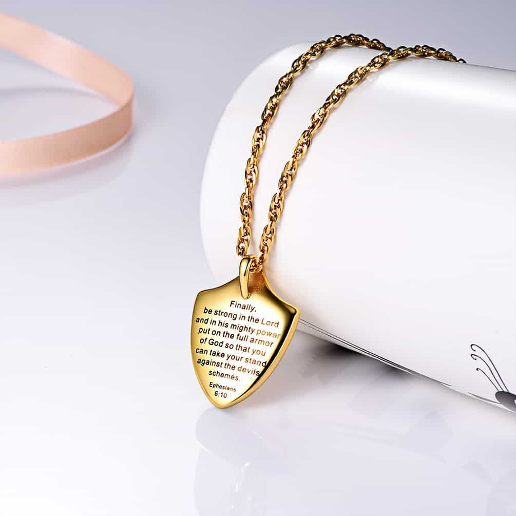 O colar com versículo bíblico de Efésios 6:10 mostra um símbolo de fé no coração. Compre um para você ou presenteie alguém que você gosta.