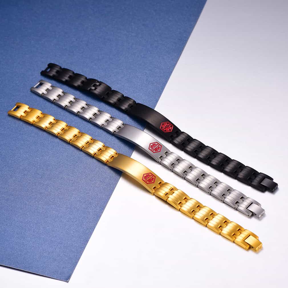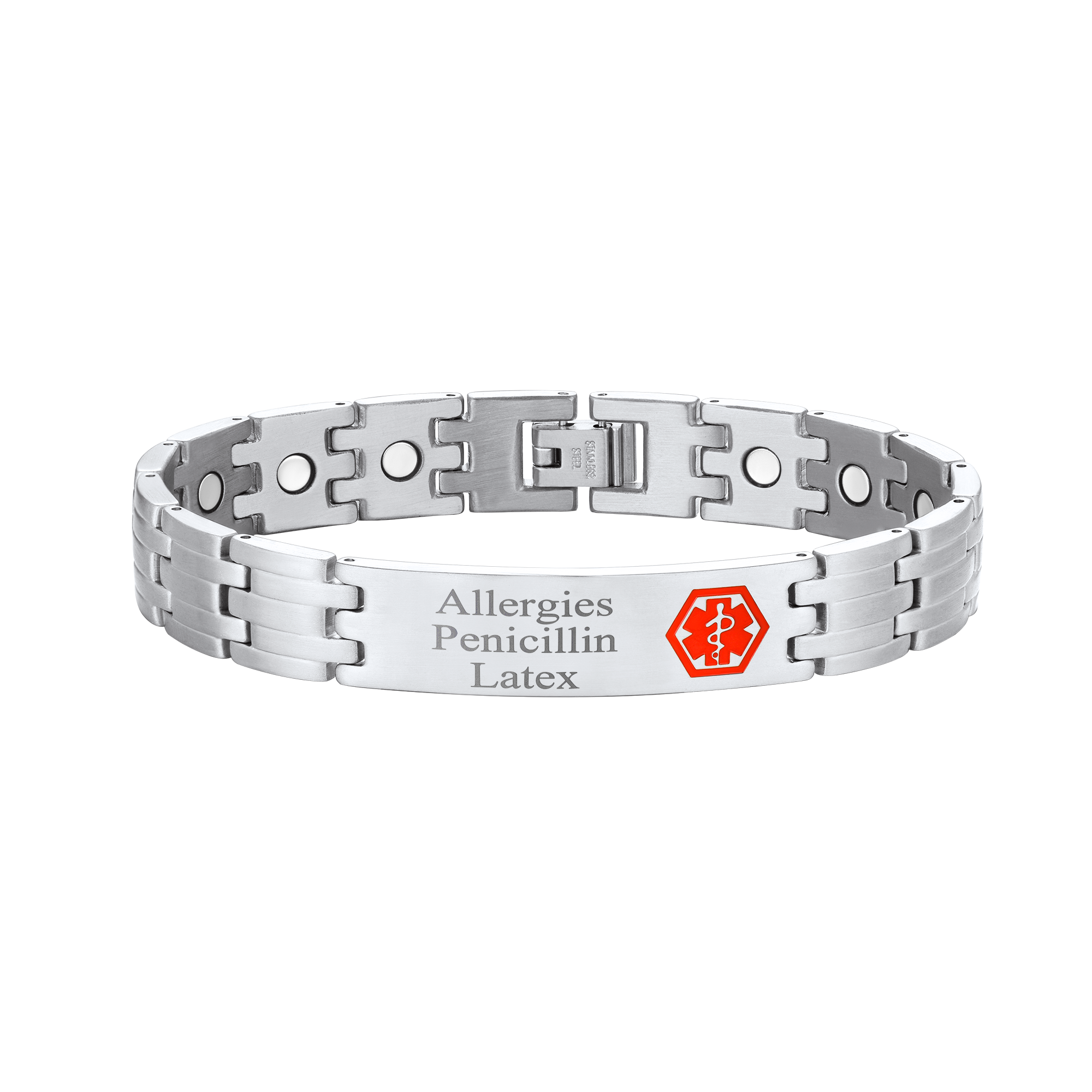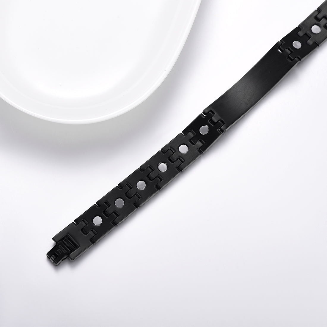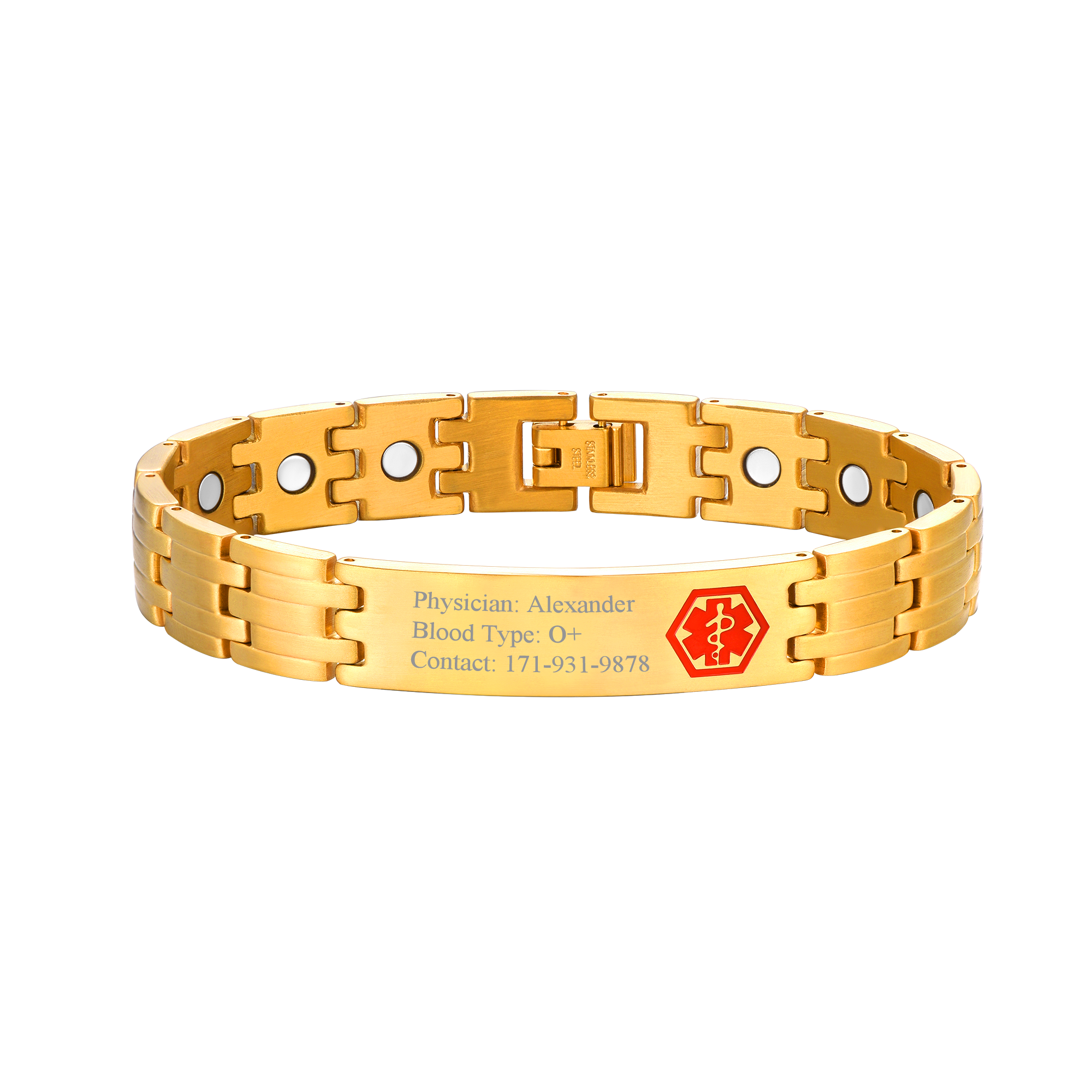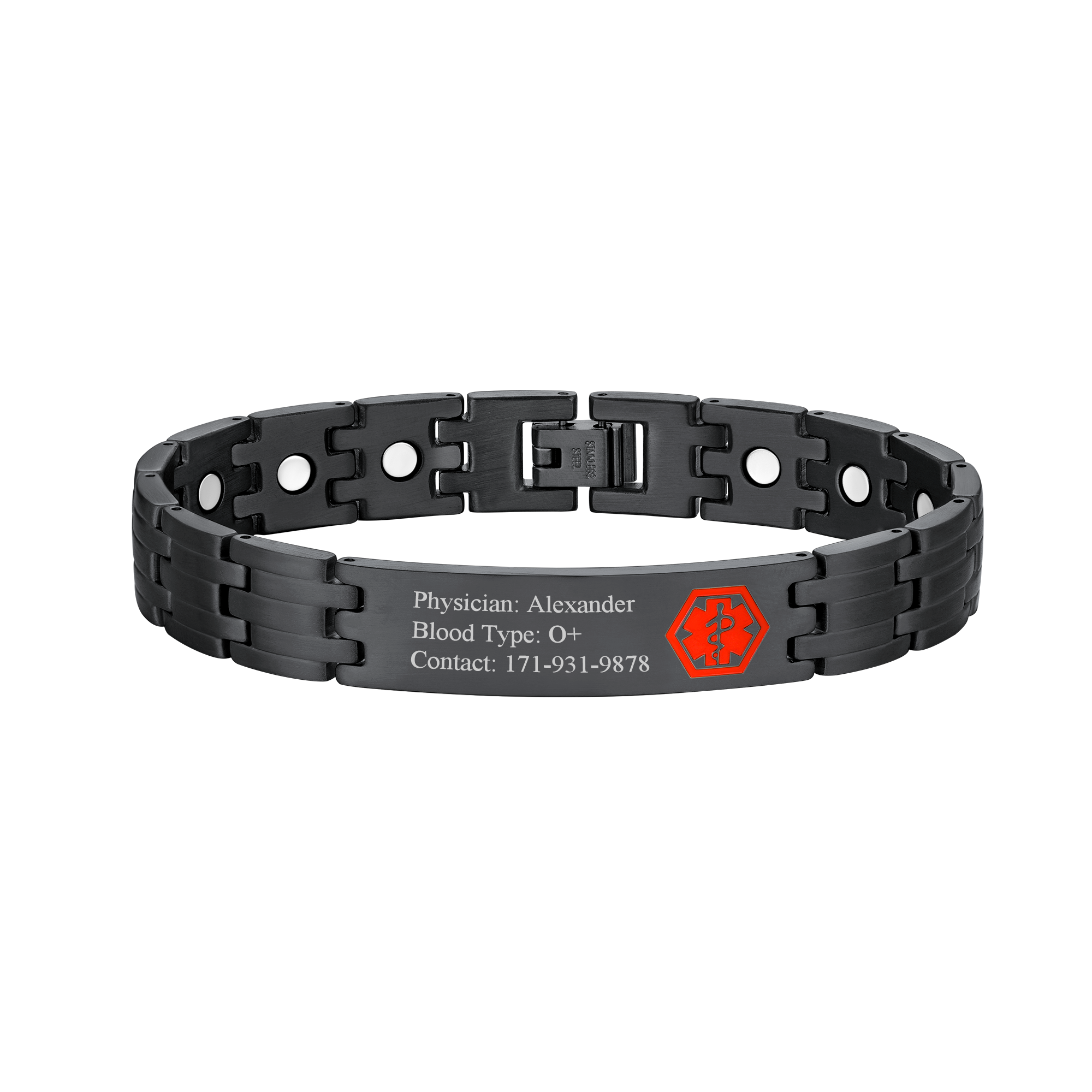 A pulseira magnética personalizada e gravada da Casaivy é feita de aço inoxidável 316L hipoalergênico, com revestimento de cor ecológico e longa retenção de cor, sem coceira nem vermelhidão, muito confortável de usar e combina com seu look do dia a dia. Uma ótima opção de presente também.