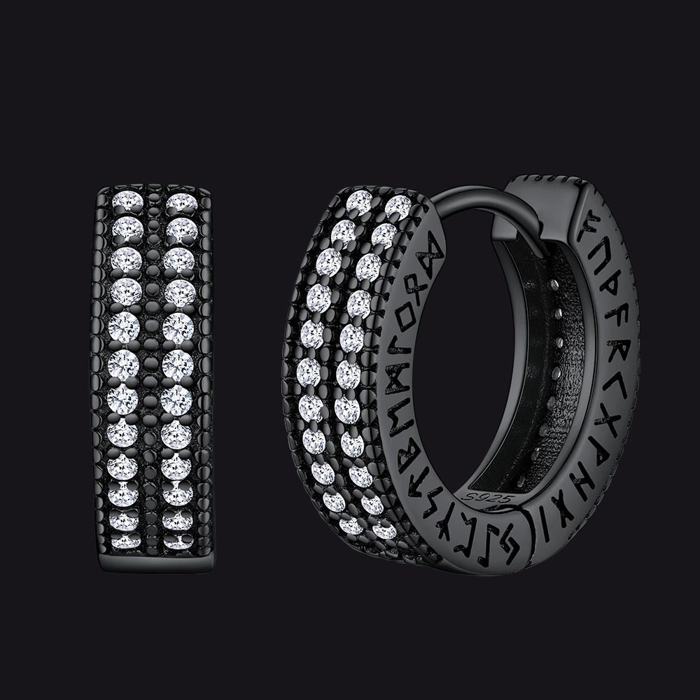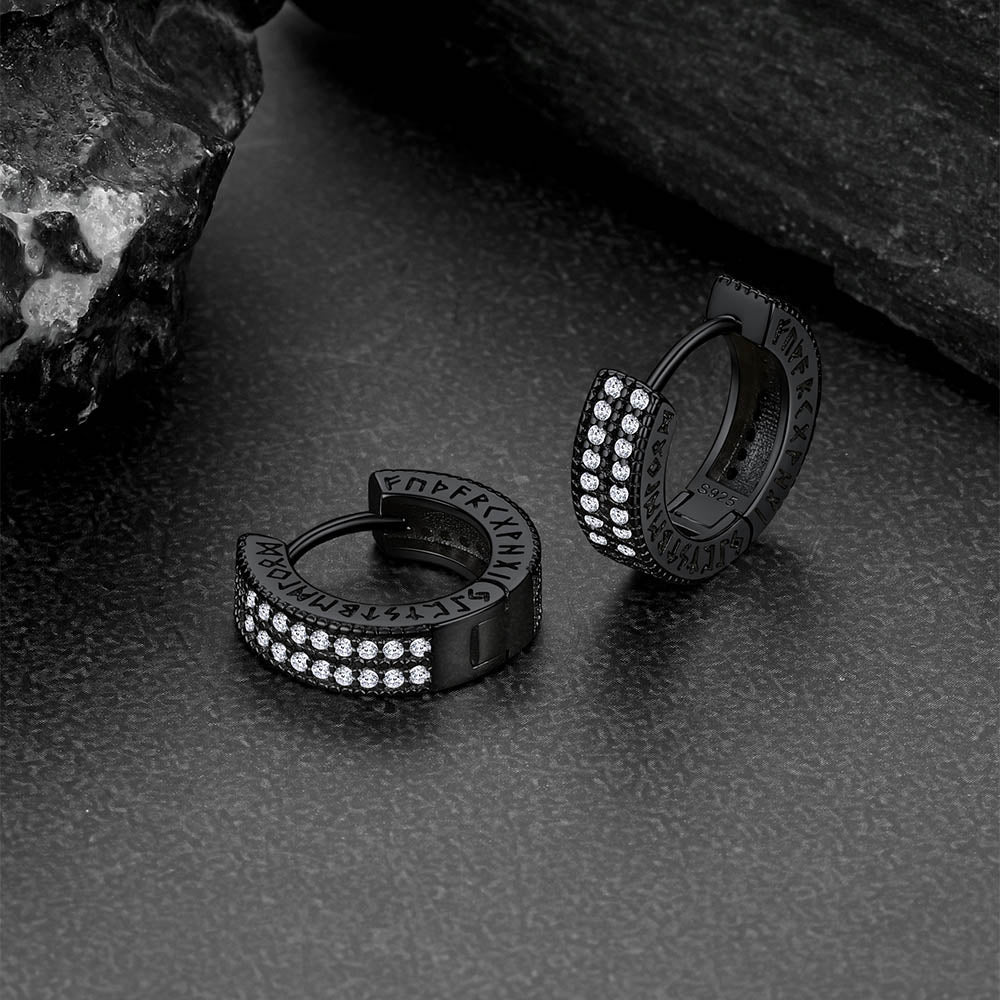 Brincos de argola Huggie com runas Viking, prata esterlina, zircônia cúbica e runas Viking para homens