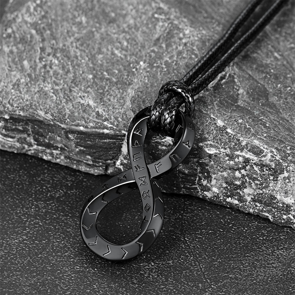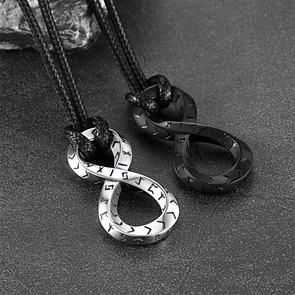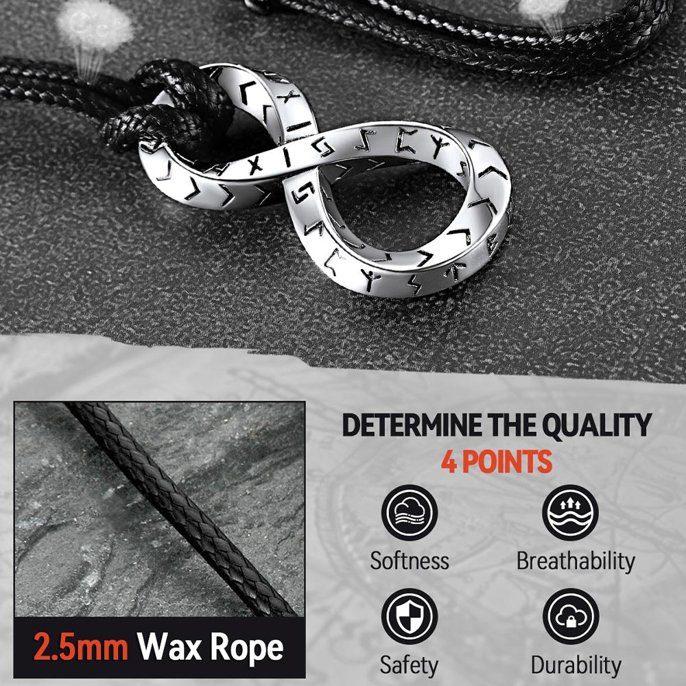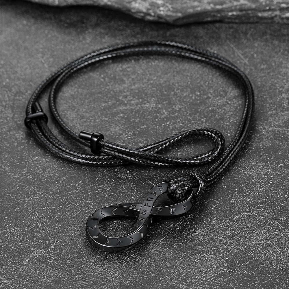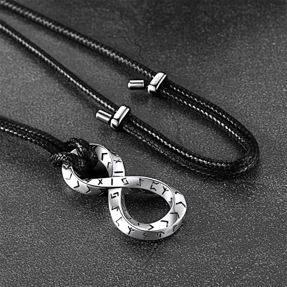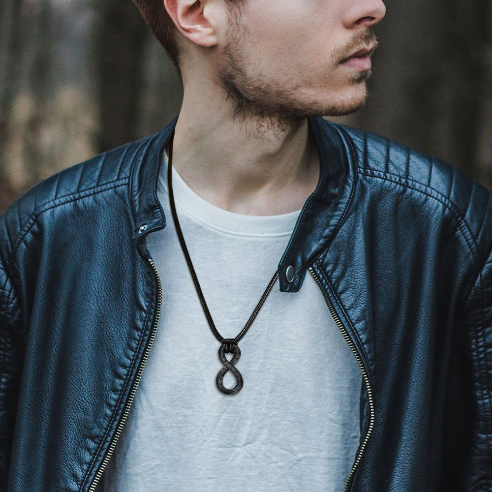O colar de couro infinito com tira de Mobius e runas vikings, moderno e vintage, realça a personalidade e a confiança de quem o usa, ao mesmo tempo em que transmite uma impressão marcante.
