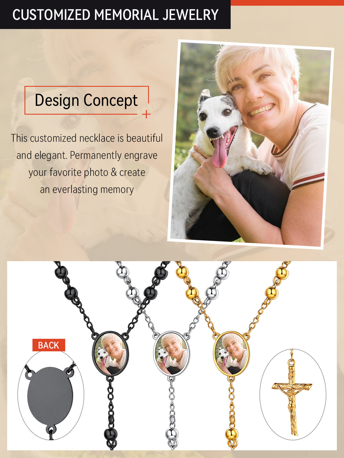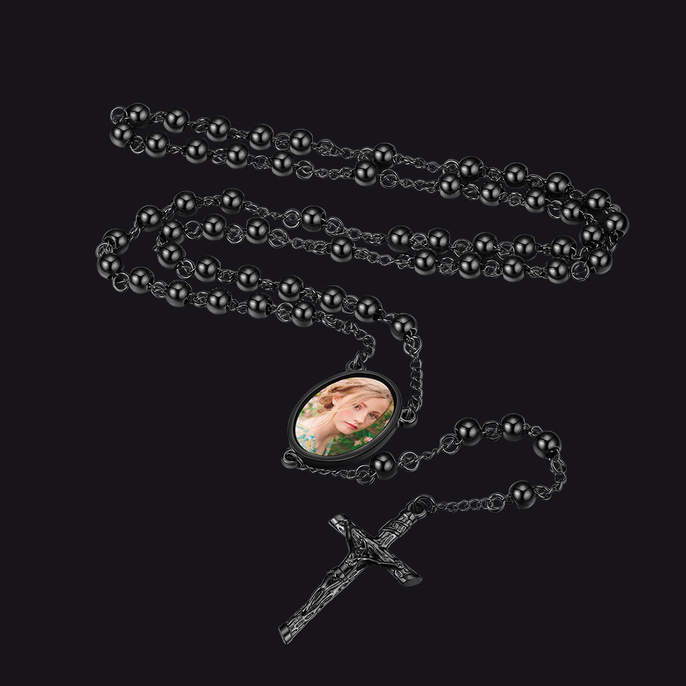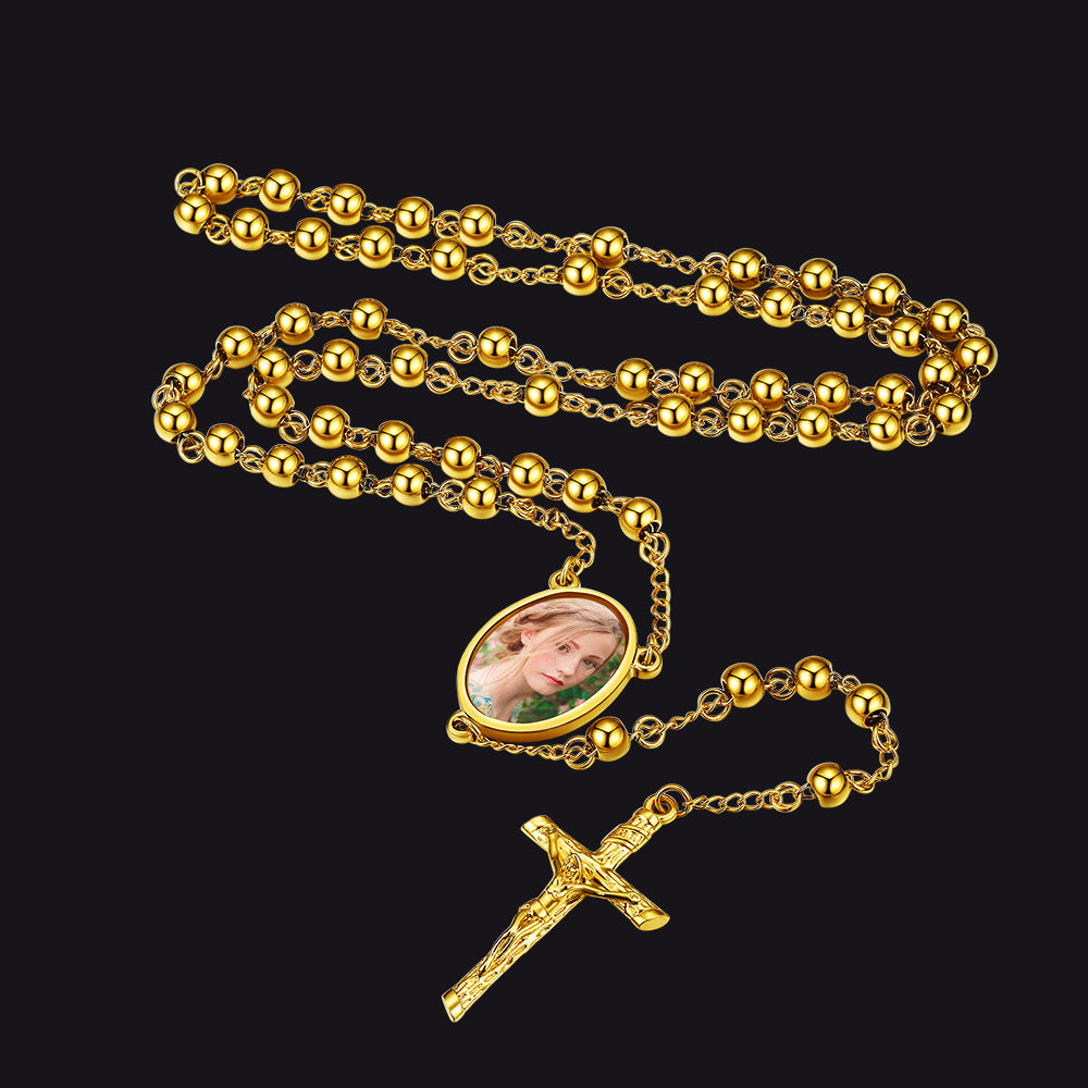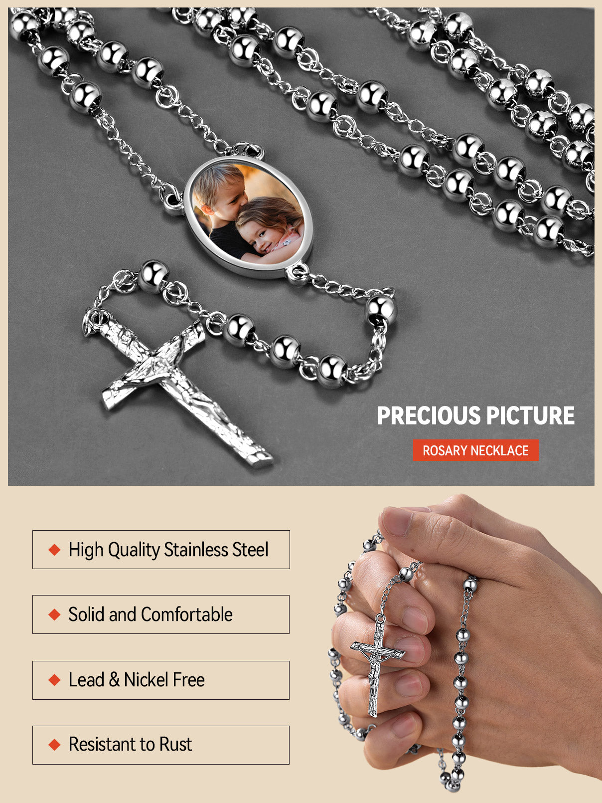Um colar de rosário personalizado com contas de oração e imagem é diferente das joias clássicas. Este pingente pode ser personalizado com o seu próprio design, e este pingente com imagem e corrente é usado para homenagear uma pessoa ou evento inesquecível. Adicionamos uma camada protetora de cola na superfície do colar de rosário para evitar que a foto desbote ou caia. Personalize um colar exclusivo com uma imagem que lhe remeta a momentos felizes.