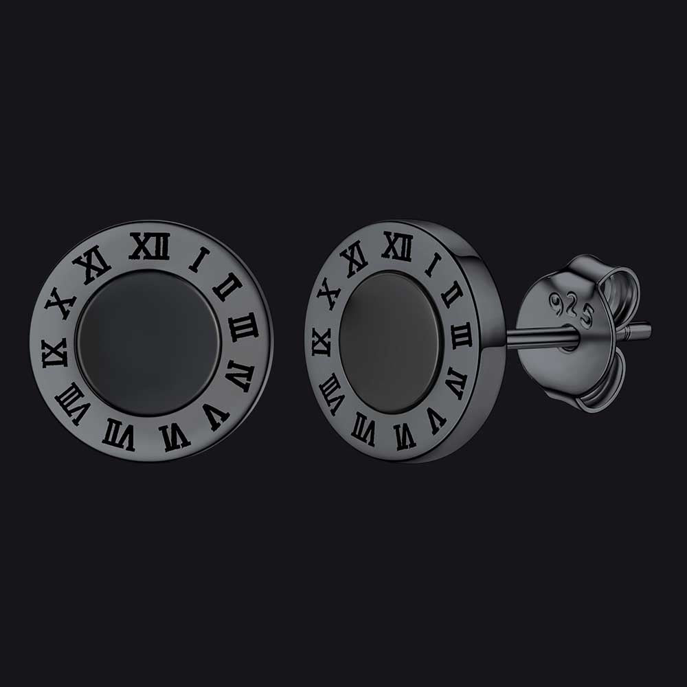 Brincos de pino de ônix preto com algarismos romanos em prata esterlina