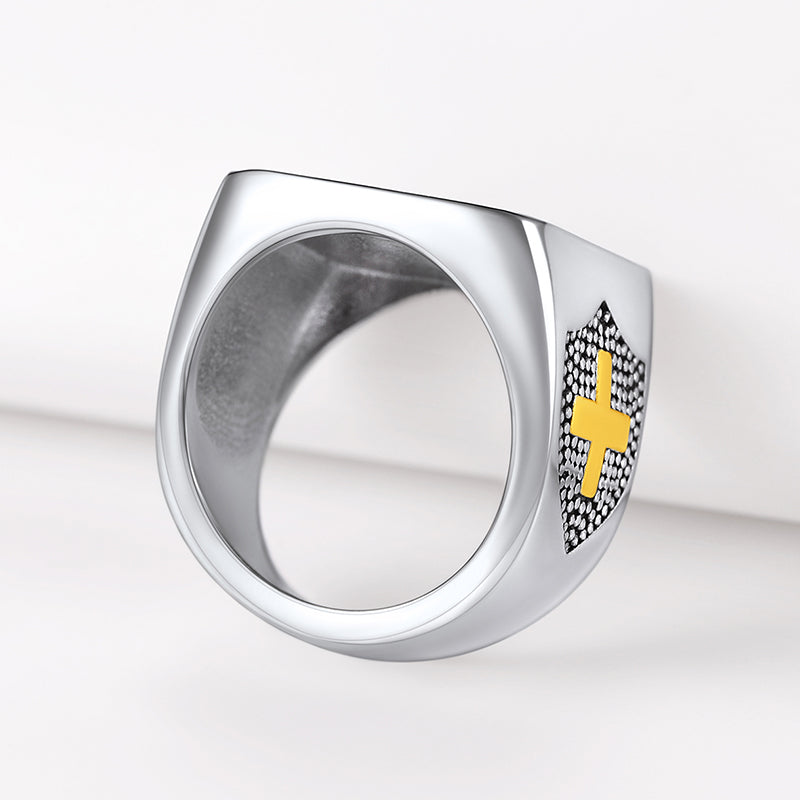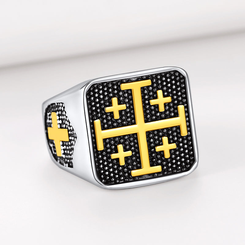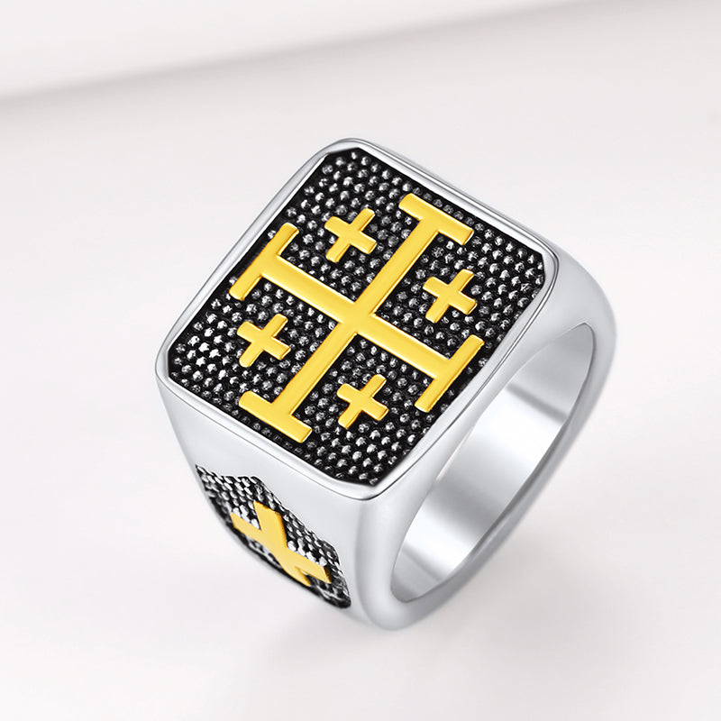 Anel masculino feito à mão, com design heráldico e cinco dobras, representando a cruz de Jerusalém dos cavaleiros templários cristãos medievais. A cruz de Jerusalém foi e continua sendo um símbolo poderoso da fé inabalável em Jesus Cristo e em Jerusalém.