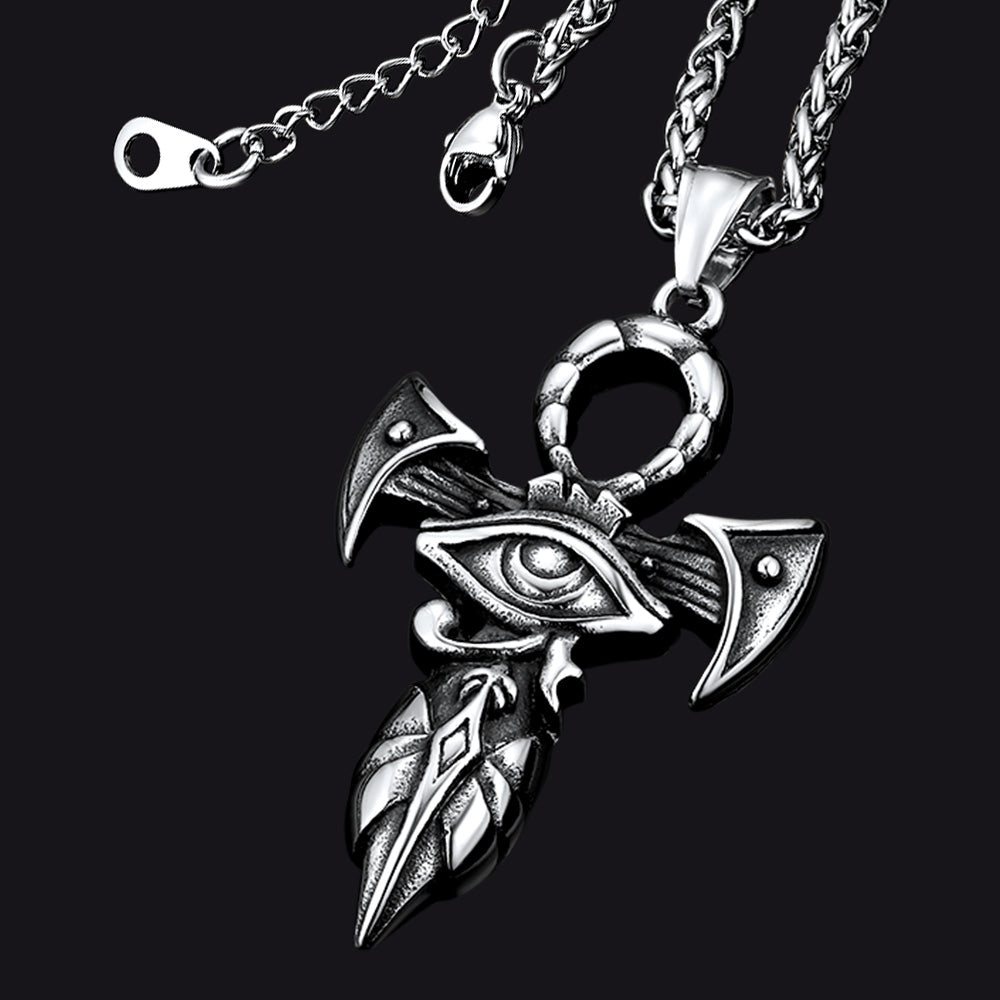 O Olho de Hórus é um conceito e símbolo da religião egípcia antiga que representa bem-estar, cura e proteção. O Ankh é um símbolo da vida e é usado como um amuleto de boa sorte, promovendo boa saúde e vida longa.