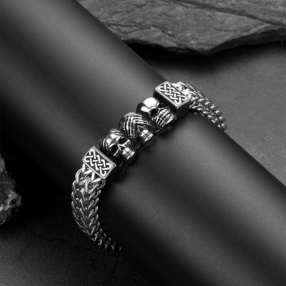 Liberte seu estilo ousado e sombrio com esta pulseira de nó celta com caveira gótica, feita em aço inoxidável premium para o homem moderno.