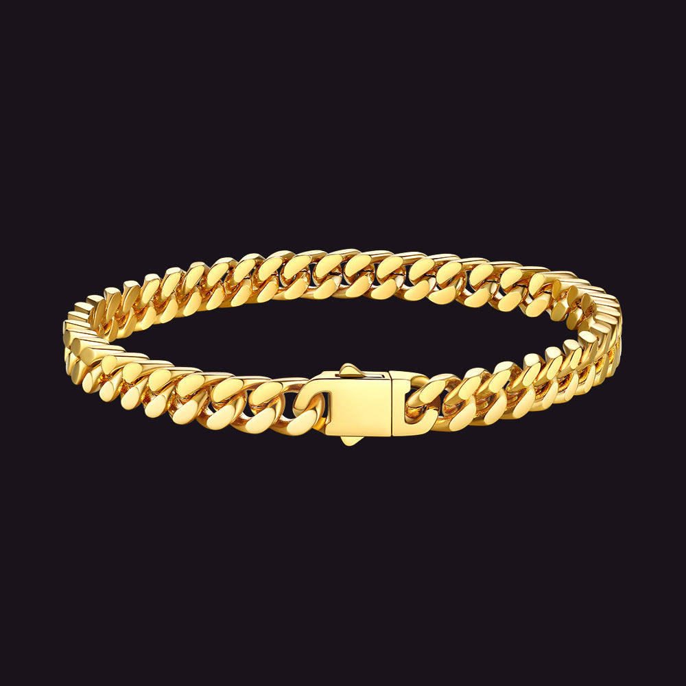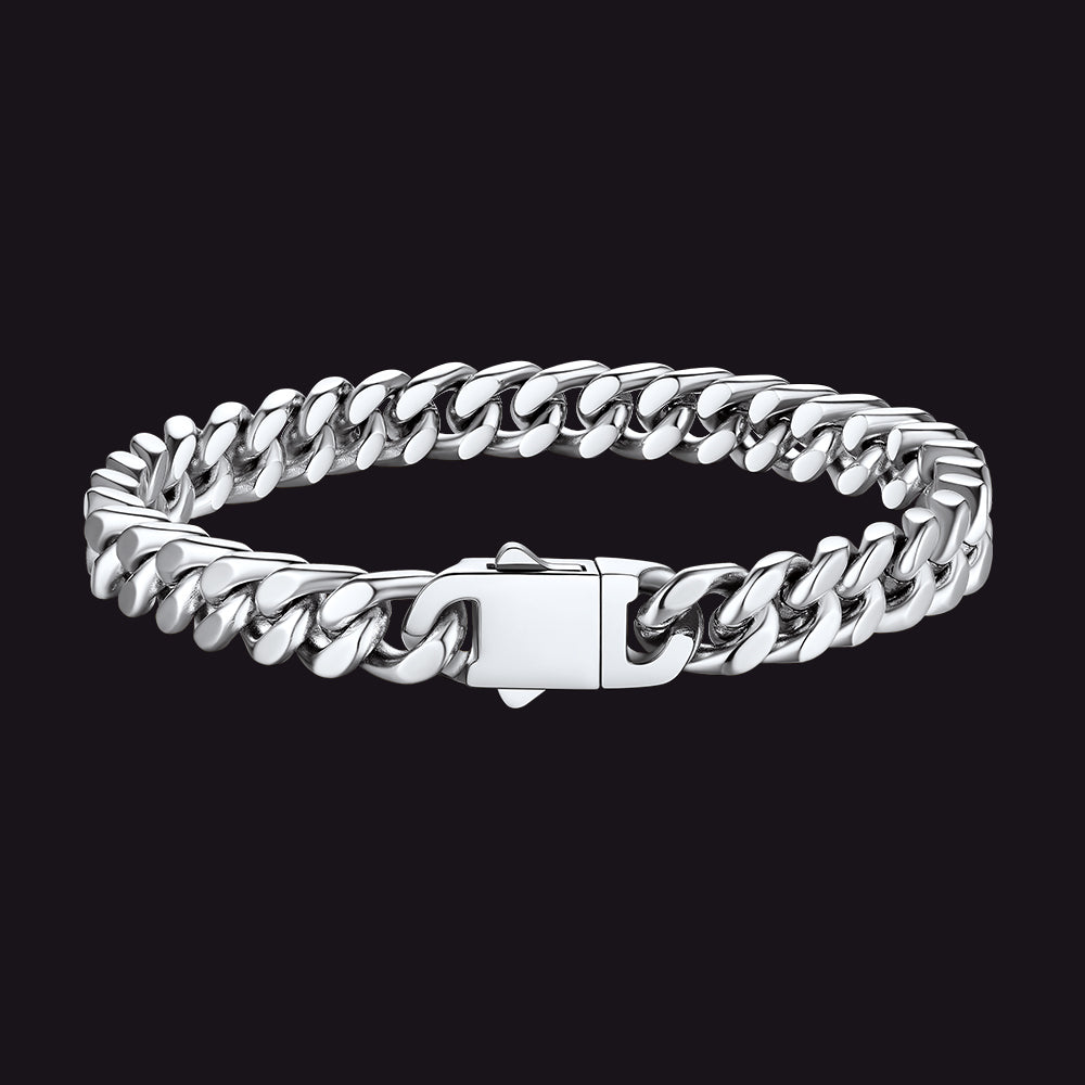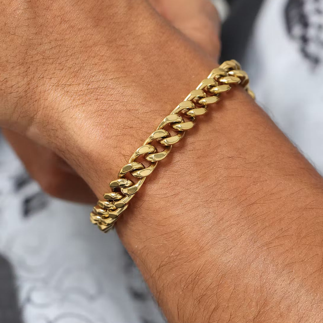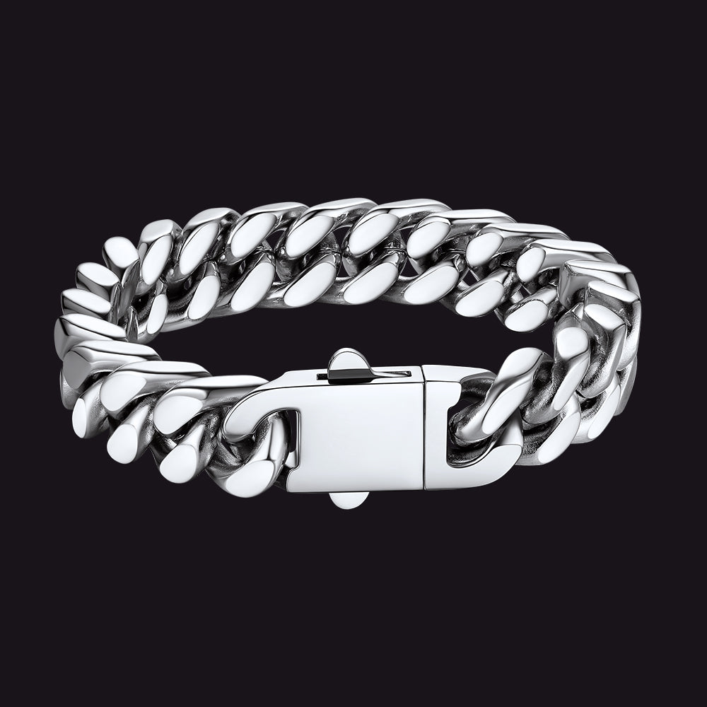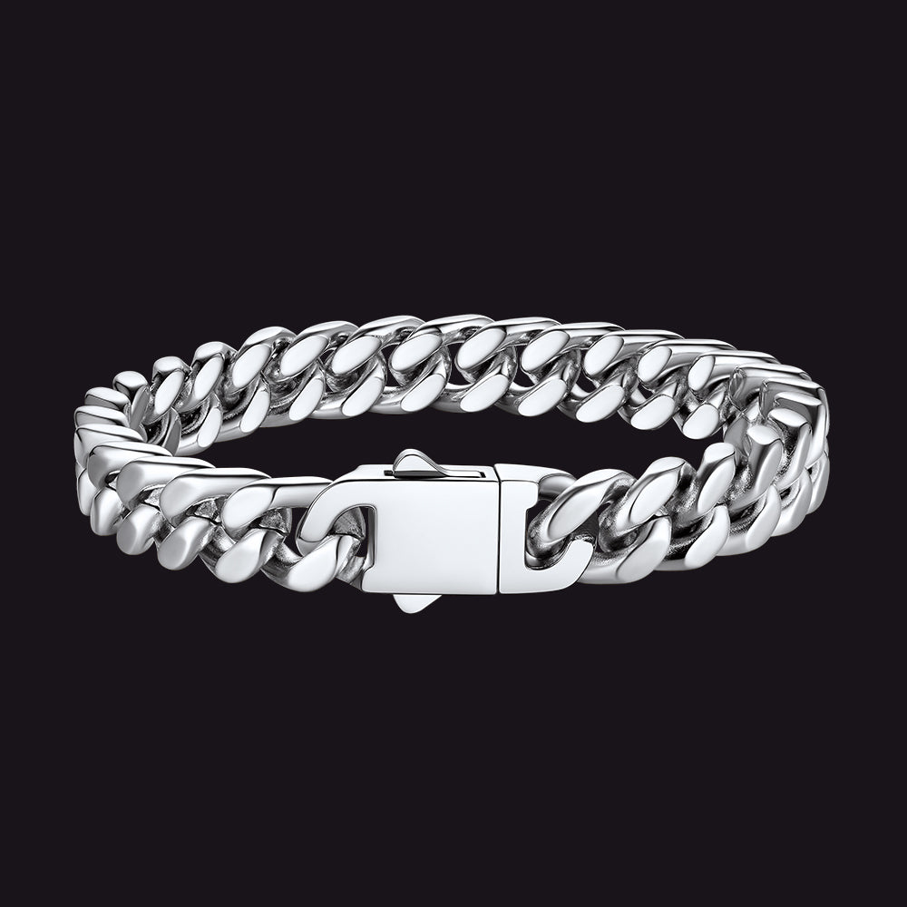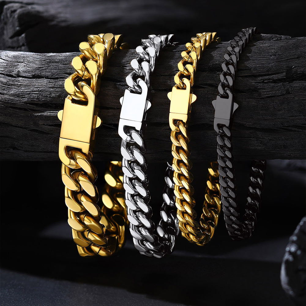 Cada pulseira apresenta um design clássico de elos cubanos com bordas cortadas com precisão que refletem a luz com perfeição, conferindo-lhe um brilho inconfundível e altamente polido. O toque robusto e pesado incorpora força e resiliência, enquanto o fecho dobrável oferece segurança, simbolizando estabilidade e confiança. Estas pulseiras são versáteis e atemporais, ideais tanto para uso casual quanto para ocasiões formais, marcando presença em qualquer ambiente.
