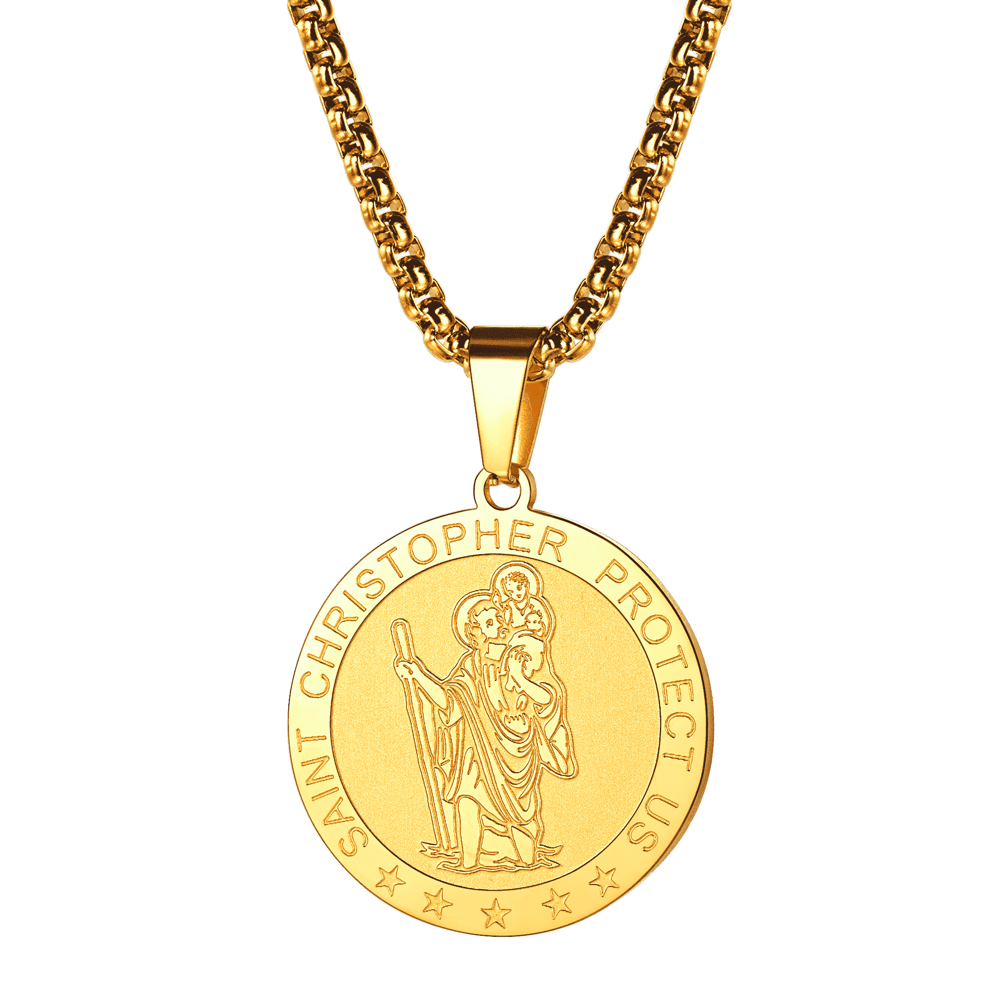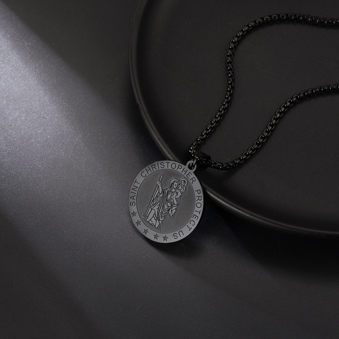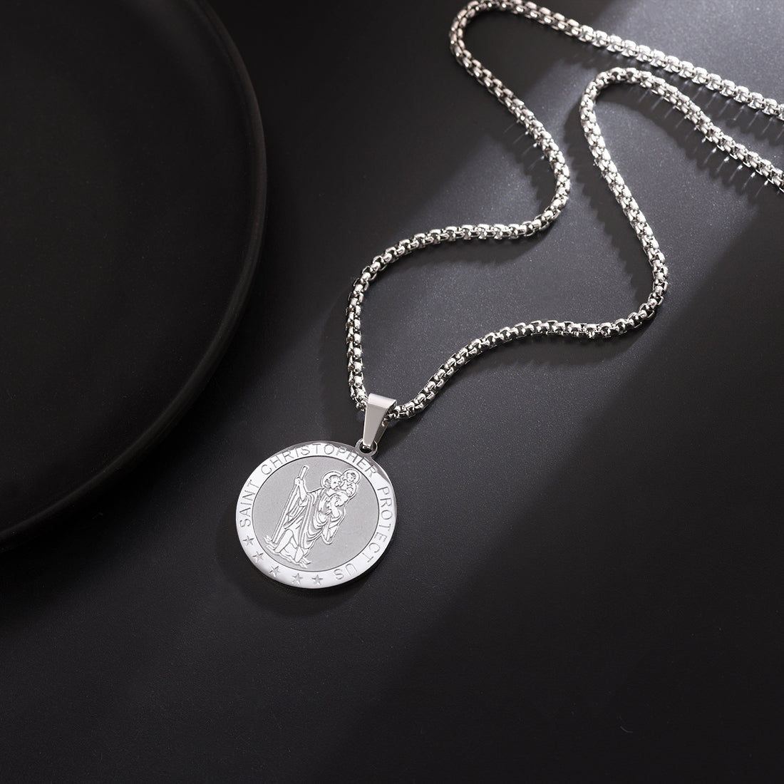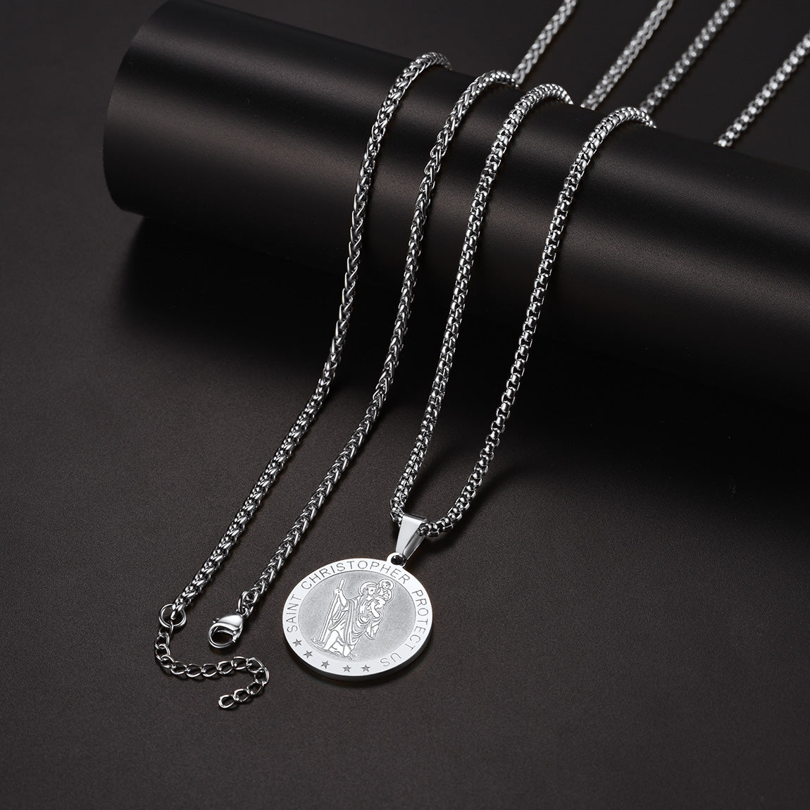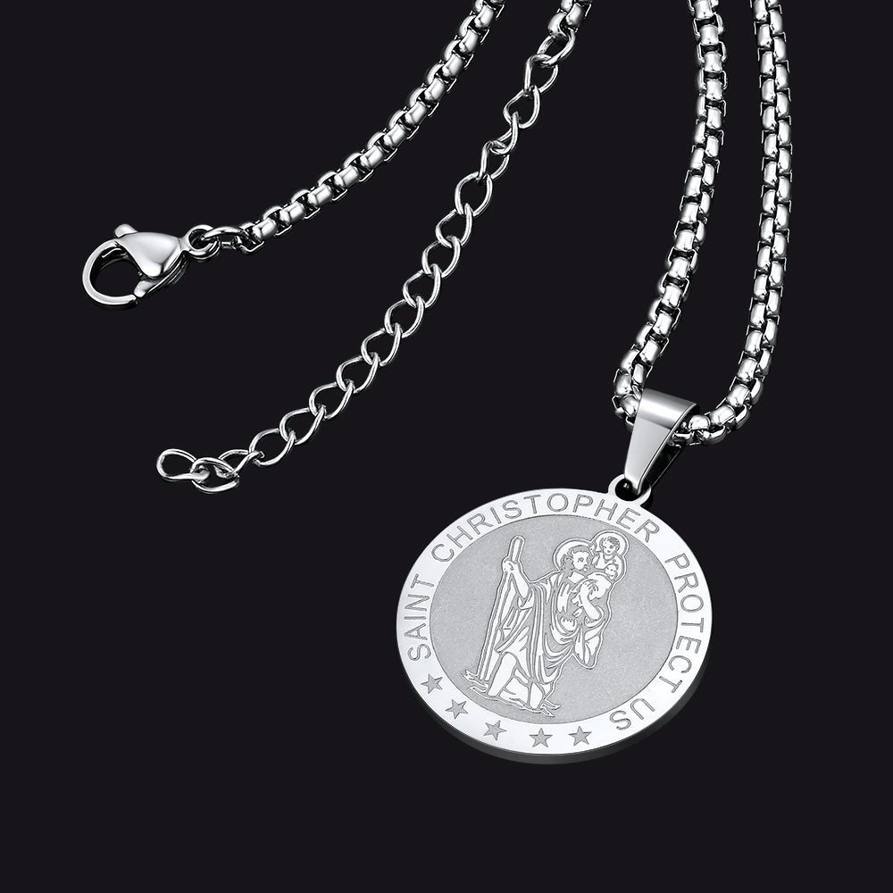Colar de São Cristóvão: O aço inoxidável de alta qualidade combina o design do medalhão de São Cristóvão. O polimento requintado é simples, clássico, luxuoso e elegante. Adapta-se a qualquer ocasião, seja para uso diário em casa ou no escritório, dentro do elemento fashion e moderno, atraindo a atenção das pessoas na multidão. Texto: SÃO CRISTÓVÃO, PROTEJA-NOS
