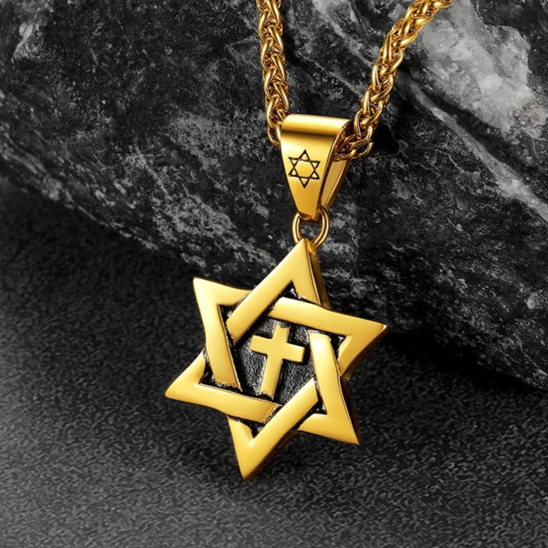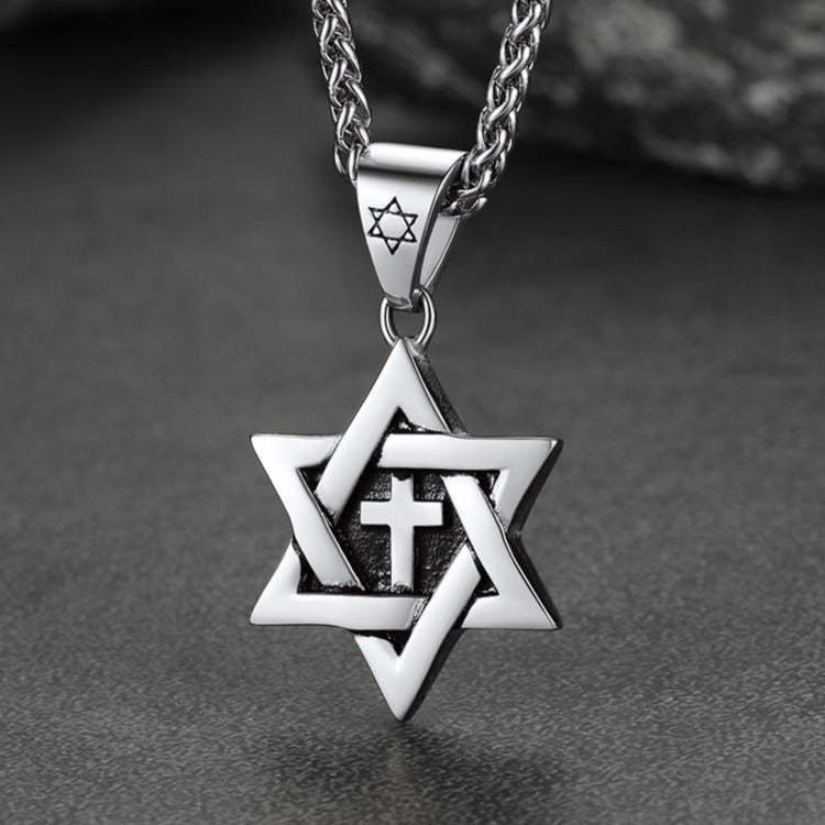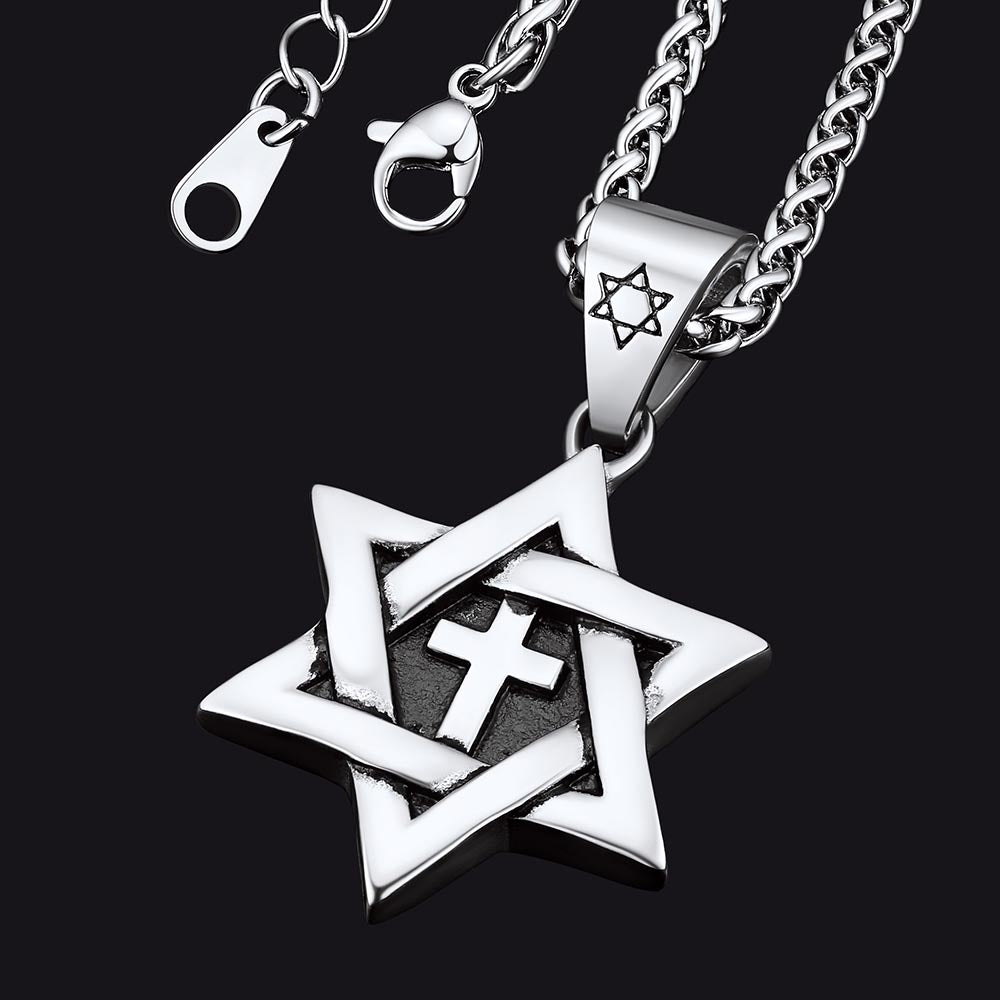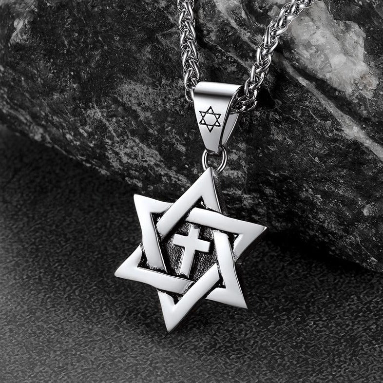Este colar com estrela de Davi e cruz apresenta uma estrela de Davi entrelaçada com uma cruz no centro. Estrela de Davi, também conhecida como Selo de Salomão. O símbolo se referia a Salomão, uma figura importante em todas as religiões monoteístas. Representava piedade, fé e a lealdade do crente a Deus. Como se acreditava que Salomão podia conter espíritos malignos e demônios com seu anel de sinete, o hexagrama tornou-se um talismã e amuleto comum nos círculos ocultistas e místicos, e até mesmo na crença popular.