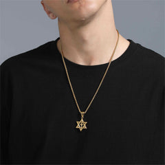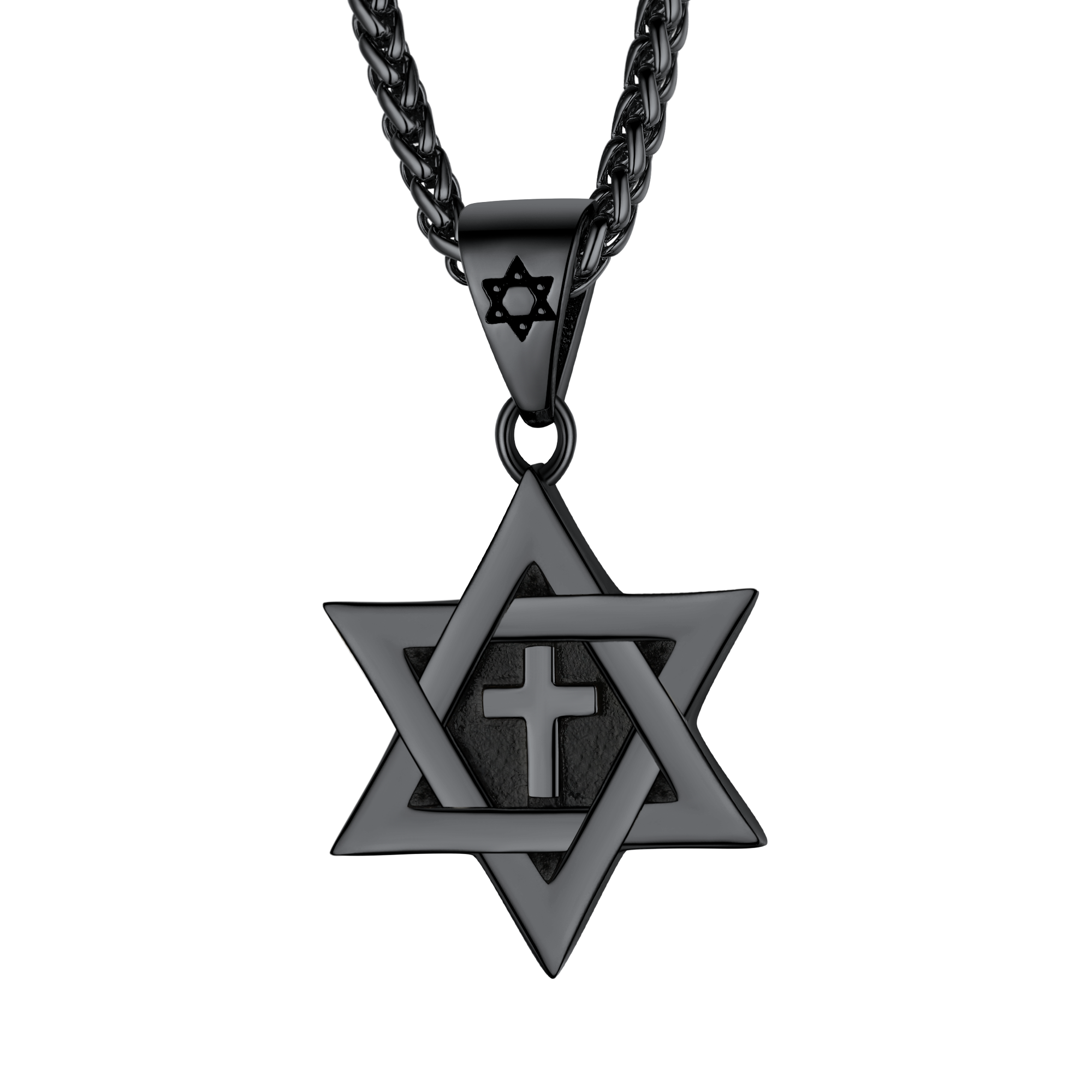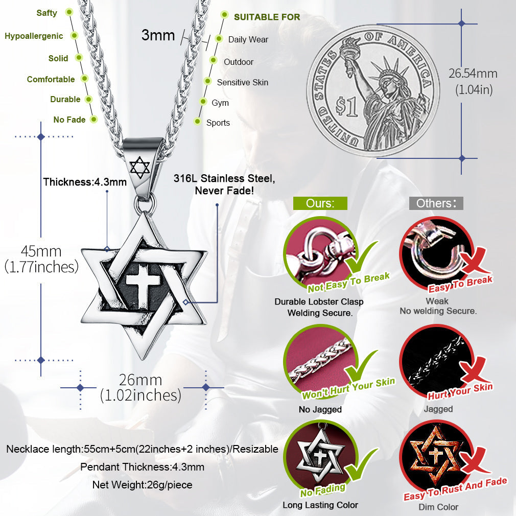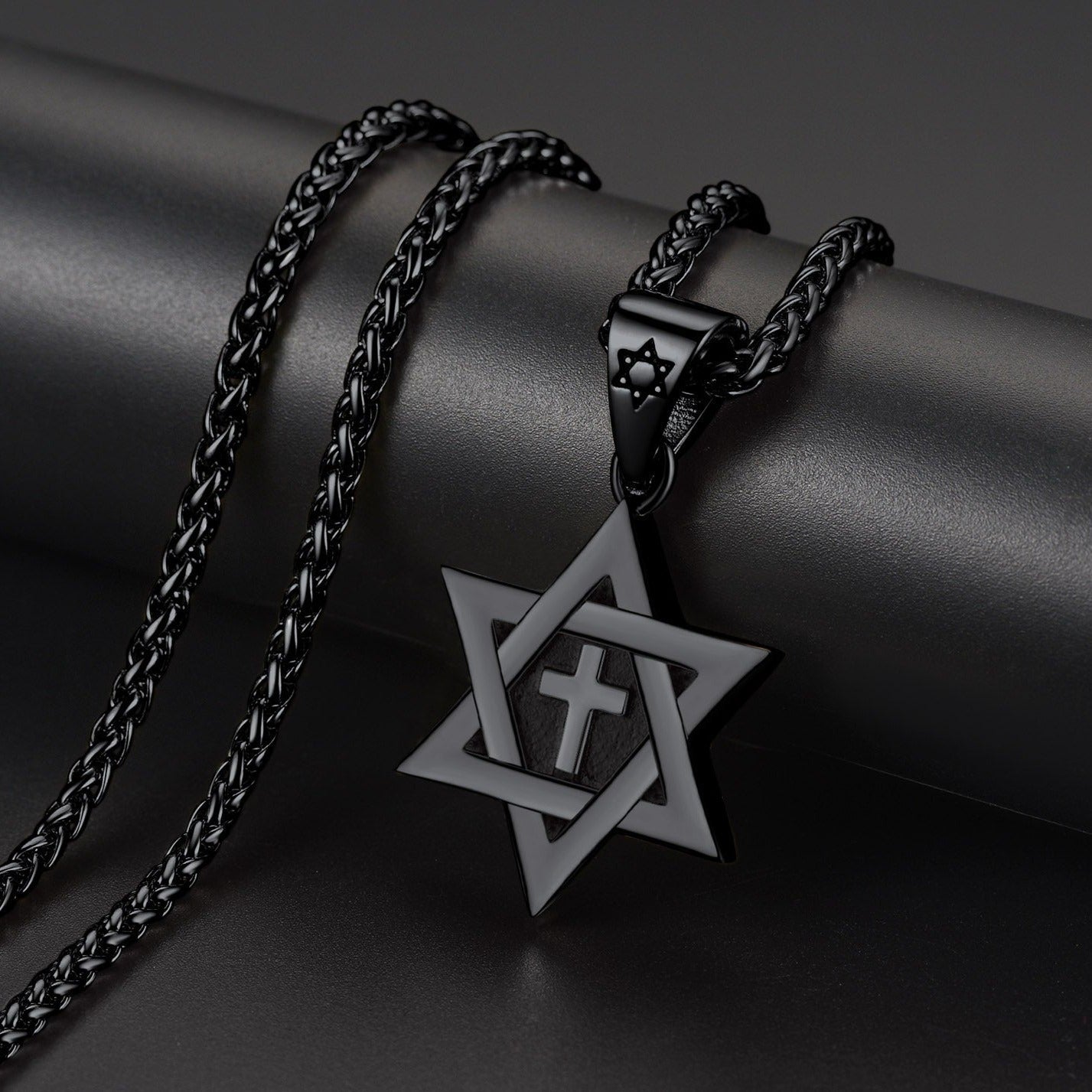 Este colar com estrela de Davi e cruz apresenta uma estrela de Davi entrelaçada com uma cruz no centro. Estrela de Davi, também conhecida como Selo de Salomão. O símbolo se referia a Salomão, uma figura importante em todas as religiões monoteístas. Representava piedade, fé e a lealdade do crente a Deus. Como se acreditava que Salomão podia conter espíritos malignos e demônios com seu anel de sinete, o hexagrama tornou-se um talismã e amuleto comum nos círculos ocultistas e místicos, e até mesmo na crença popular.
