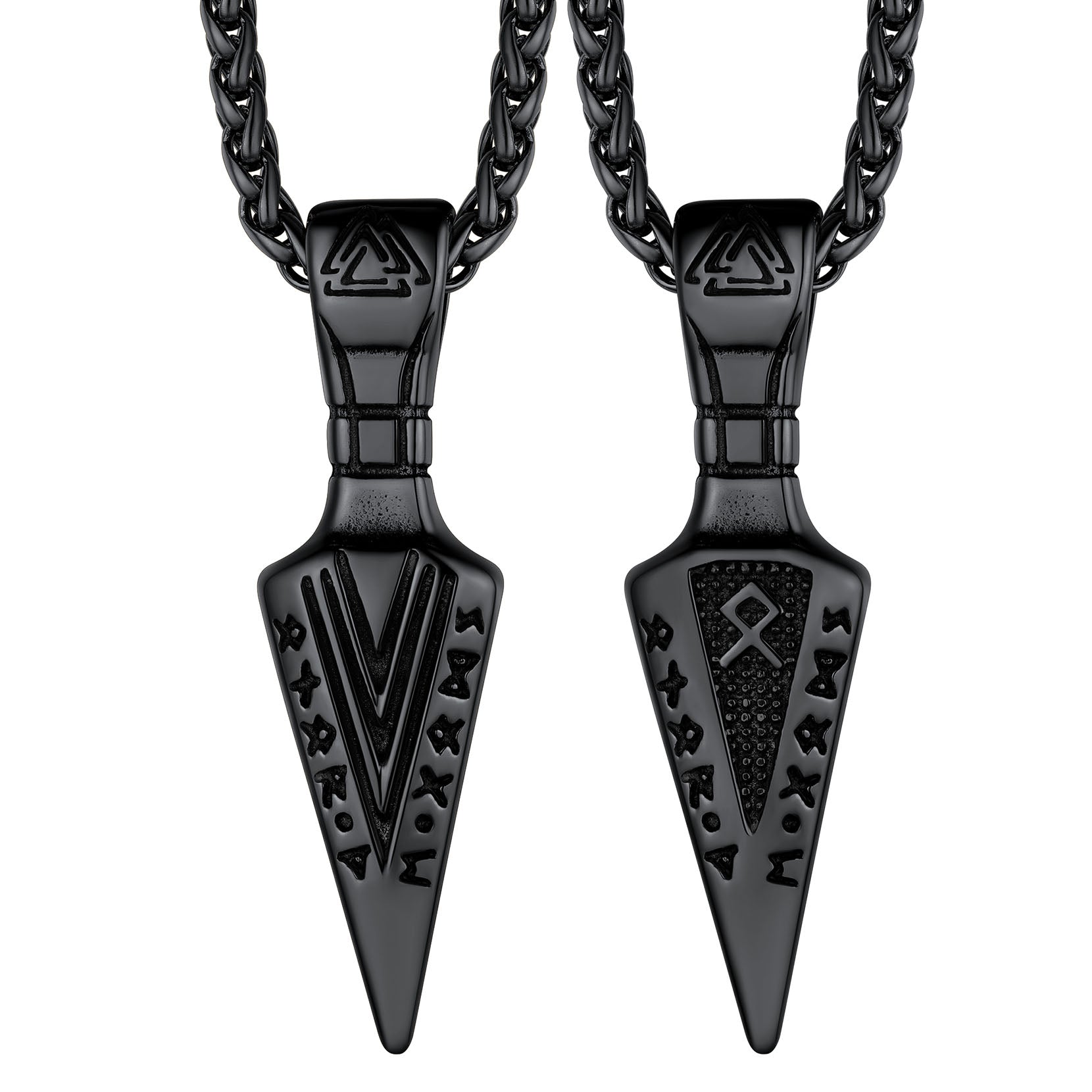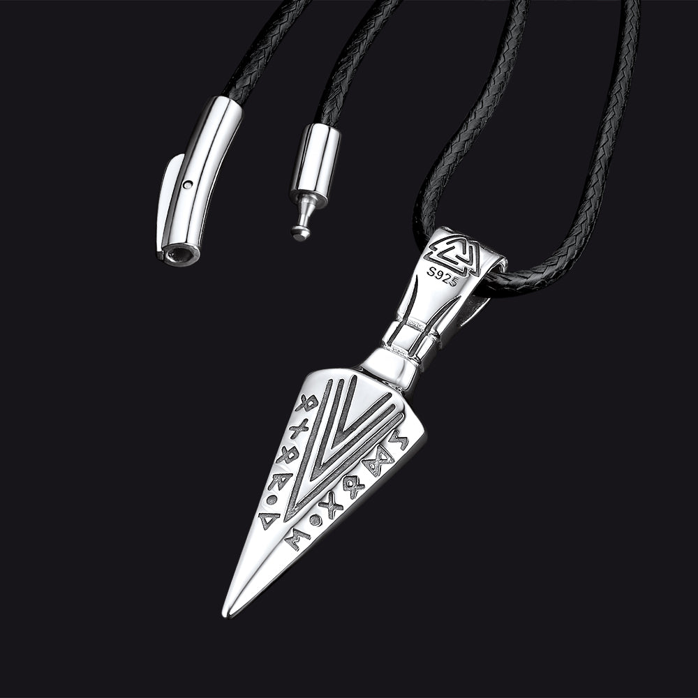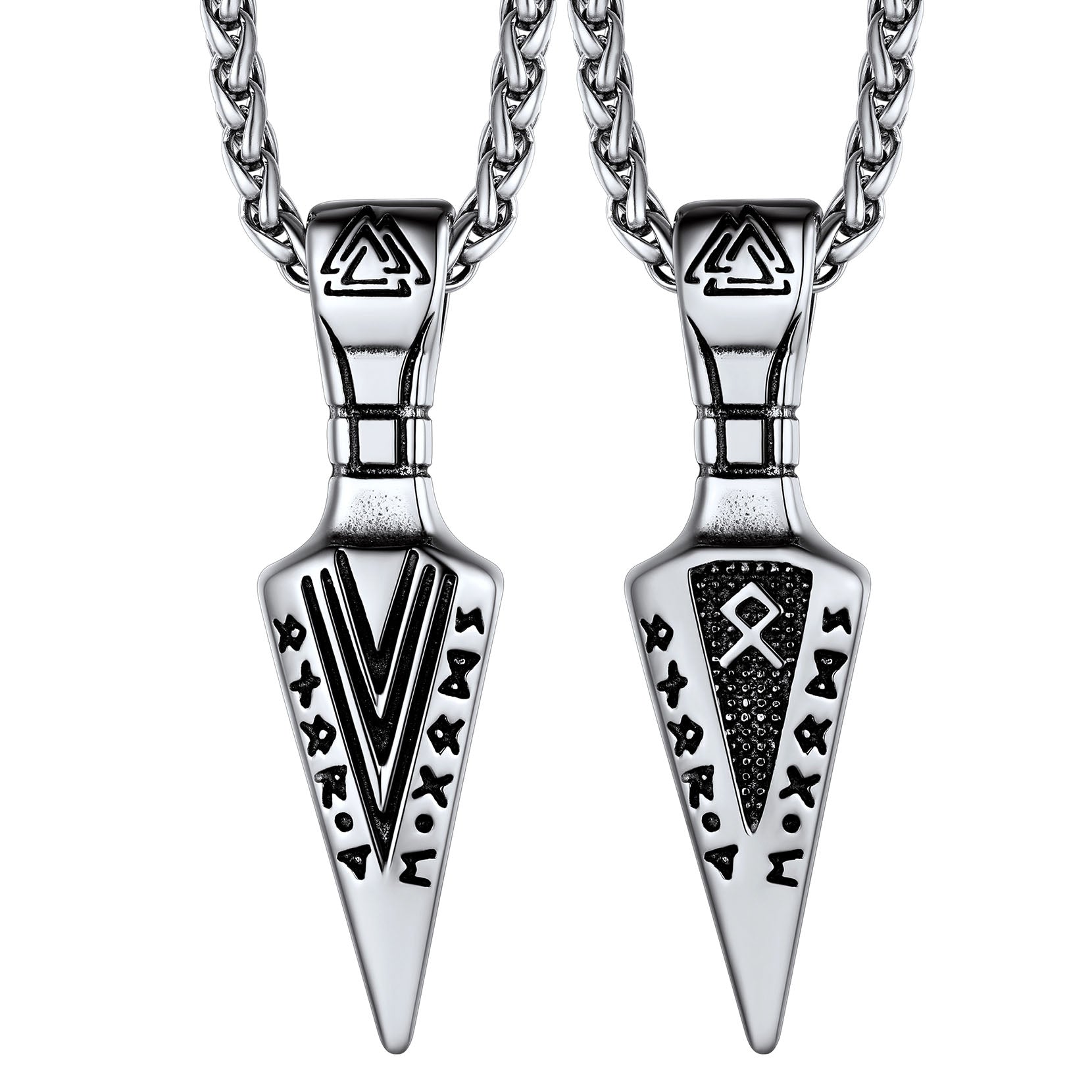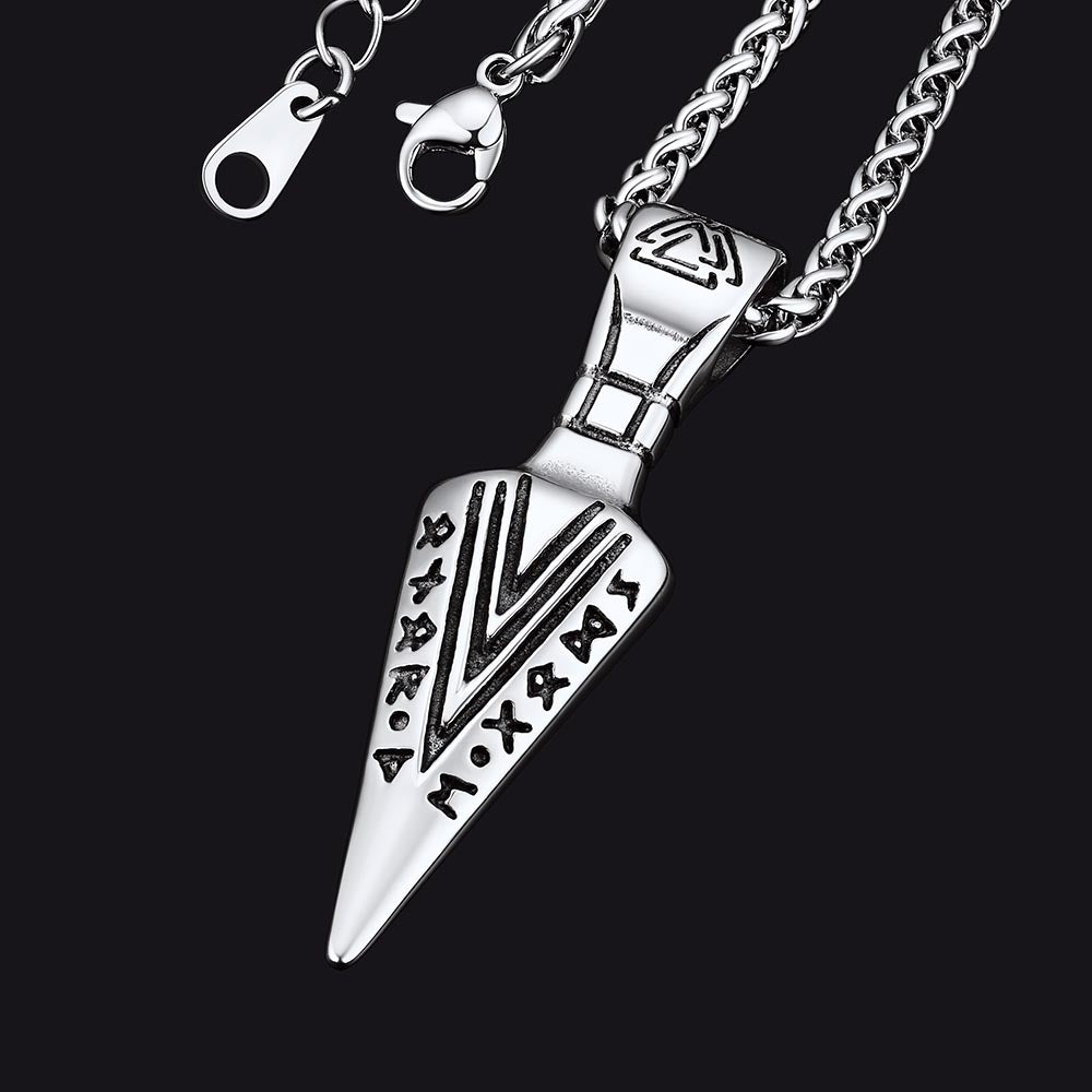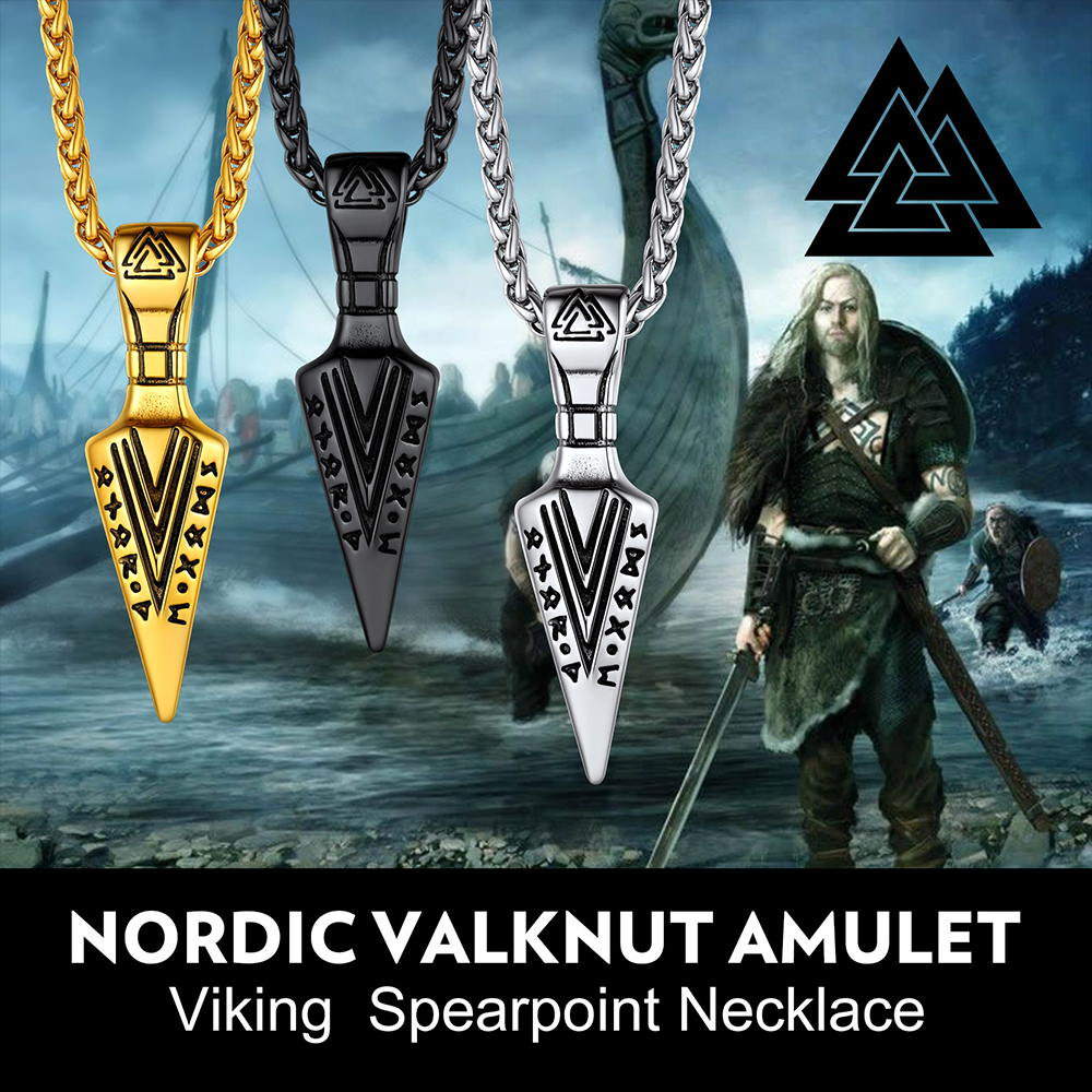 A lança Gungnir e o símbolo Valknut transmitem a sensação de divindade e a inscrição rúnica envolve o pingente com mistério sagrado.